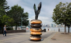 The largest piece, towering over the city’s denizens at 17-feet tall, serves as a makeshift vase with black, spray-painted tulip poking out of it. Photography: Nicholas Knight. Courtesy of Art Production Fund