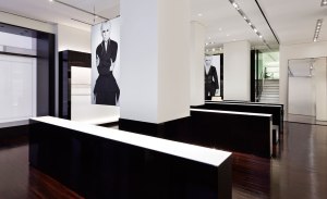 Monolithic, dark zebrano wood plinths serve as displays for its women’s accessories, while clothing is reverently presented in dark wood boxes laid into the space’s surrounding white walls