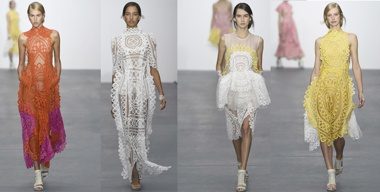 Turkish born, British based designer, Bora Aksu’s collection was inspired by his childhood summer holidays spent in his family holiday home in the turkish coastal city of Izmir. His fashion focus this season was on bursts of colour and different shades of light which he reflected in the use of silk and lace in his garments. Aksu’s ‘magical garden’ was emphasised with his use of fresh flowers, that models wore as part of a headdress.