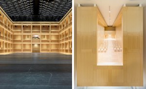 An internal shot of the theatre shows the sheer-boarded timber walls which provide a beautiful simplicity to the space