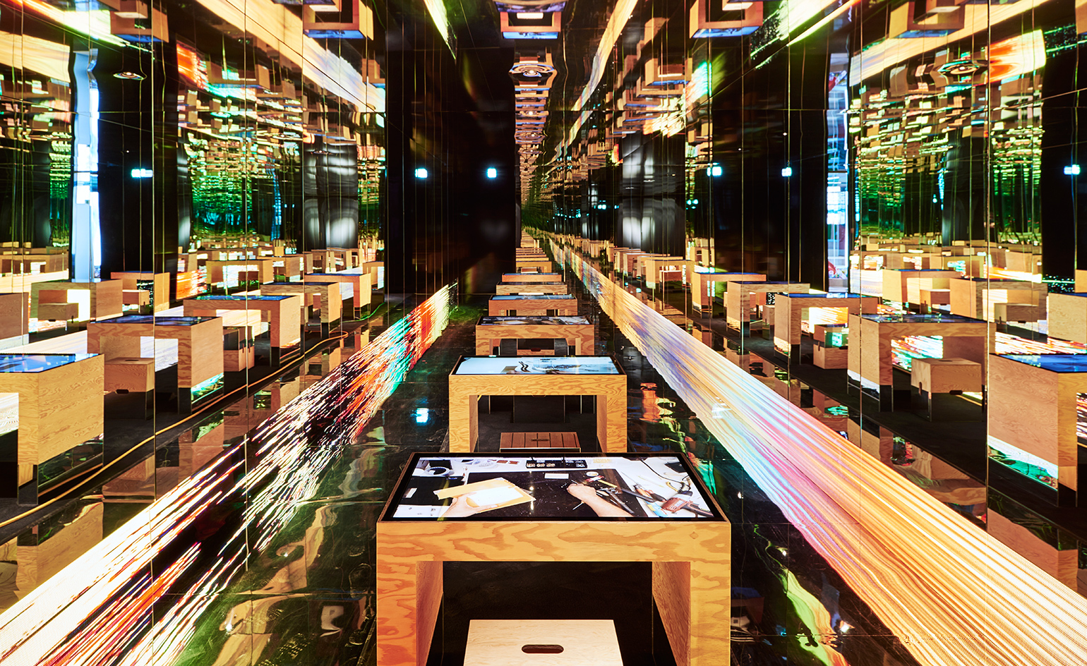 Throughout the exhibition, much emphasis is put on the ‘hands’, the craftsmen and women who devote themselves to producing the pieces. In a mirrored room, footage of the ‘hands’ at work is shown at desks.