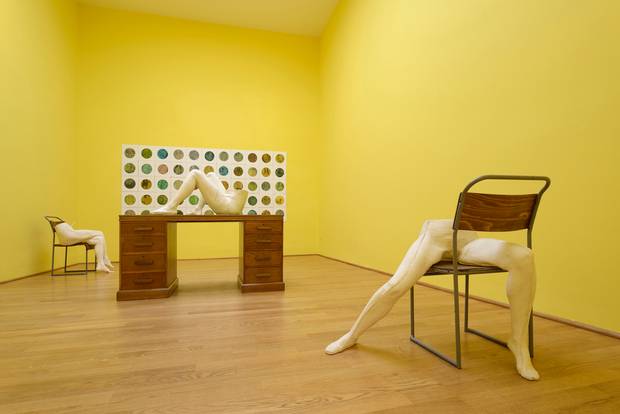 The dominant sculptural objects are formed from plaster casts of female figures, bifurcated and shown only from the waist down—a number of them were cast from Lucas’s own body. In the interview, the artist refers to them as “topless muses,” the opposite of “busts.”
