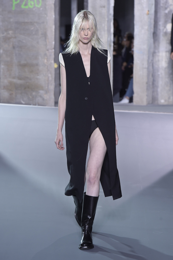 This season Rick Owens took a somewhat delicate turn. The collection featured an extended silhouette. The designer employed silk organza, which he crafted in a range of short dresses, to create extra volume at the shoulders, or lovely folds around the hips or the small of the back.