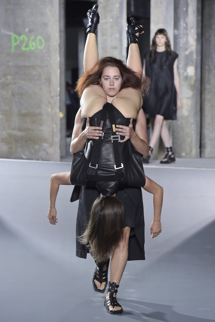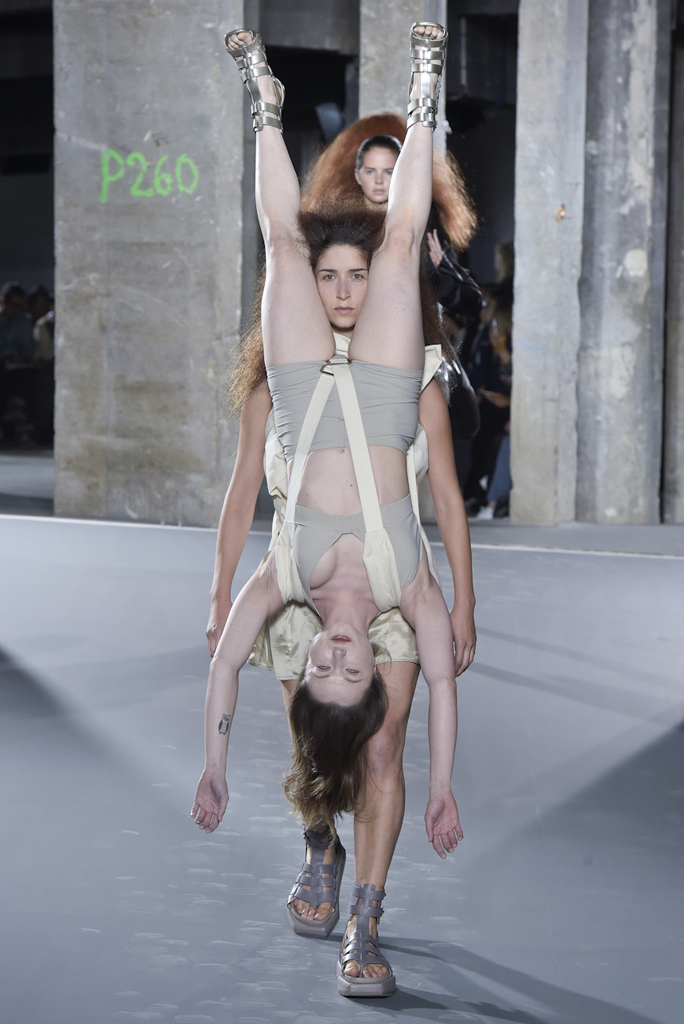 Before the show Rick Owens explained his concept of “Women carrying women”, how he conscripted gymnasts and dancers to portray the acts of supporting, cradling, even giving birth. It was impressive in the strength required, and serenely managed, by the group of stoic women who walked the runway in Rick Owens designs. Owens was aware that people might only see bondage whereas his intention was “admiring the mystery of what a woman is.”