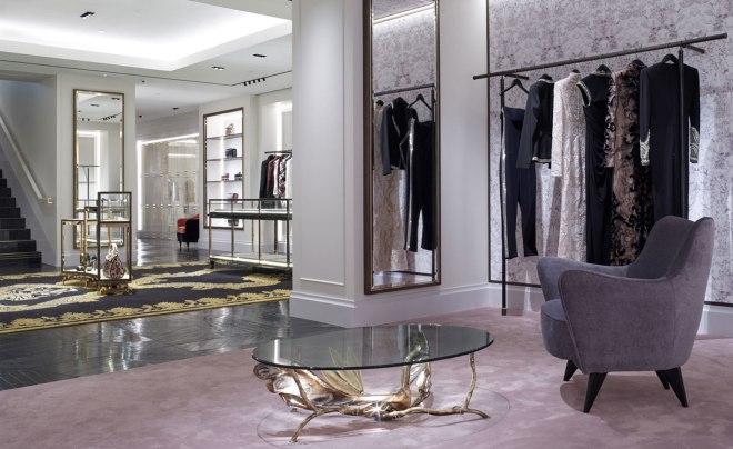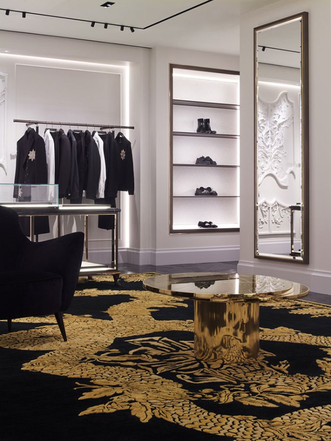 The lower ground floor which accommodates menswear and evening-wear has a more dramatic, masculine feel and is dominated by two large black and gold brocade rugs from McQueen’s collaboration with The Rug Company. These two floors are connected by an ornate staircase fashioned from a monolithic block of Nero Marquina marble with white onyx handrails and polished brass detailing. Other design highlights include fitting rooms upholstered in nova-suede, flora, fauna and skulls molded in plaster and furniture gems from Giò Ponti and Jacques Duval-Brasseur.
