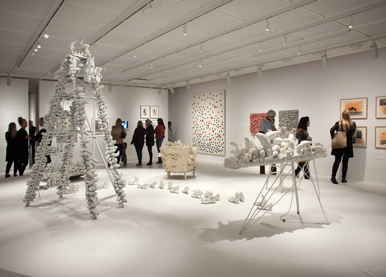 The space “Cosmos,” comes full circle as visitors see her more recent, nature-inspired motifs, first witnessed in her earliest work but now rendered in large paintings and sculptures.