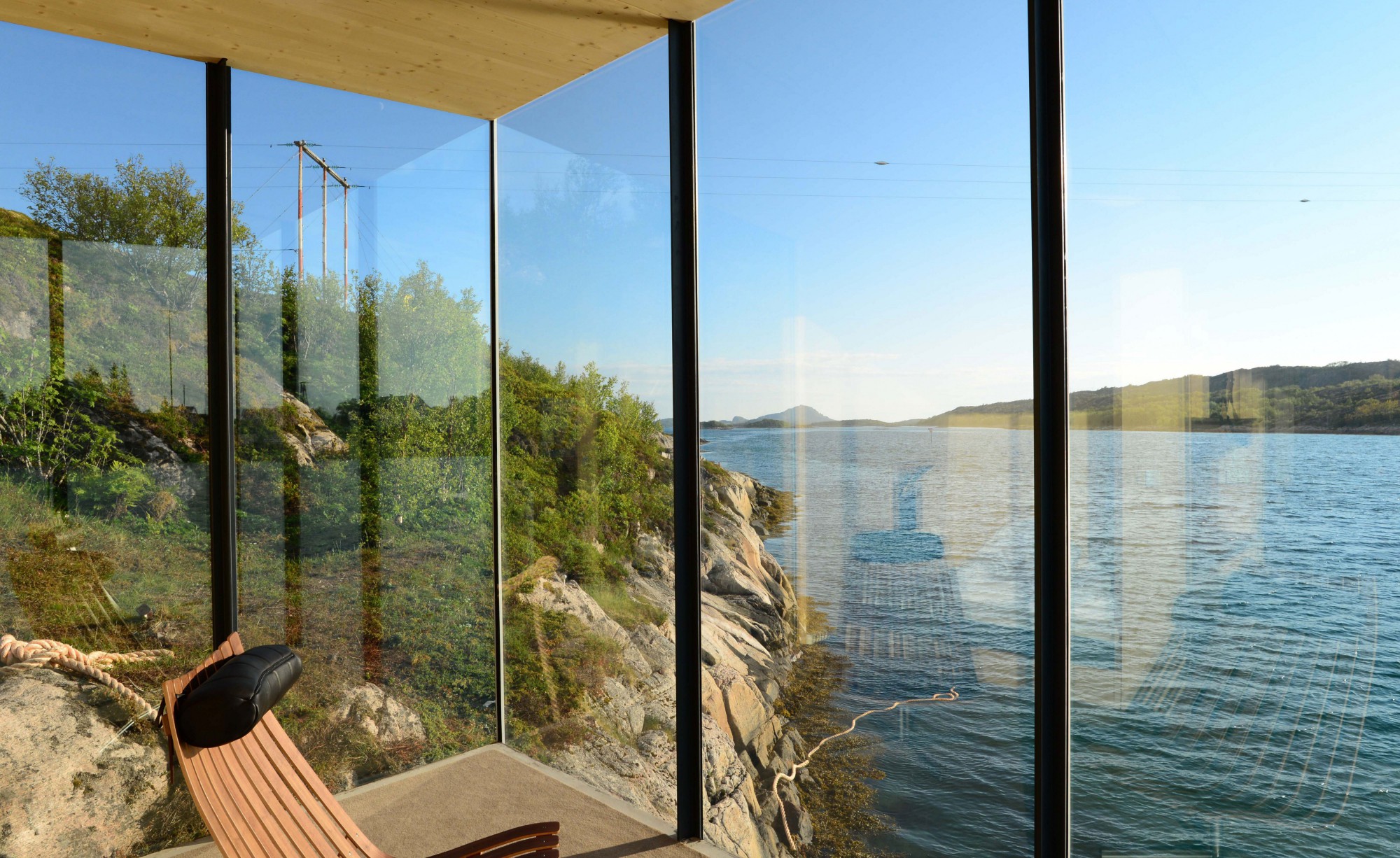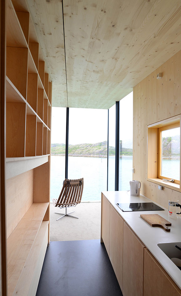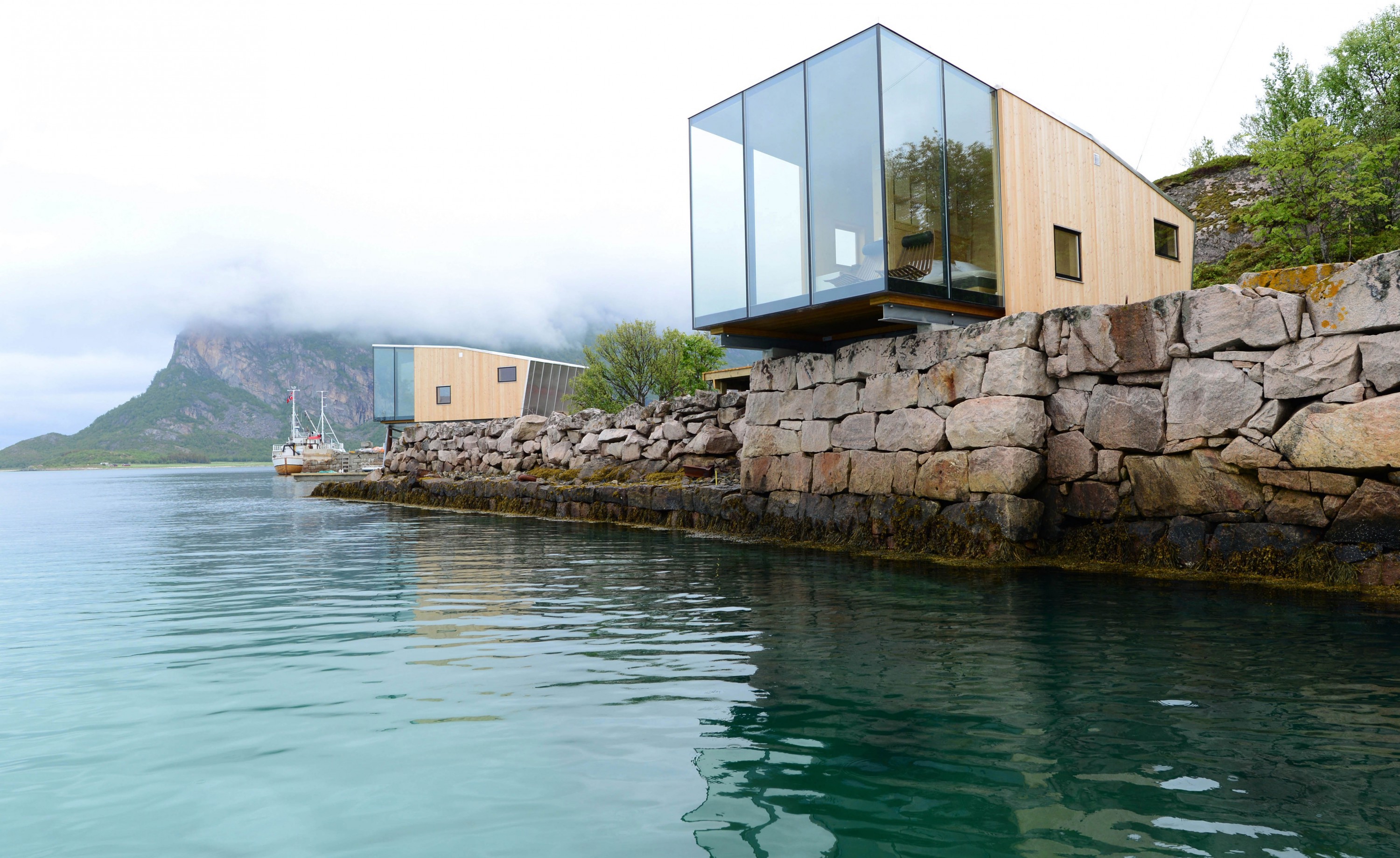 Tromsø-based architect Snorre Stinessen referenced traditional Norwegian country cabins for his modern lodgings. The cabins are fronted with floor-to-ceiling glass ensuring guests optimum immersion in the area’s idyllic and rugged surroundings. Each lodge includes a bedroom, bathroom and a high-performance Corian kitchen. Lodges are laid out in a modular style with mutable features such as walls that flip down to form tables.