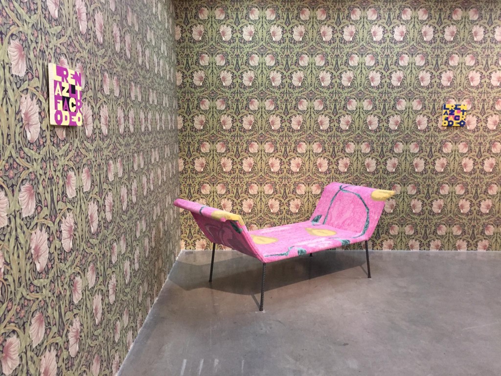 With their all-over patterns, carved out in relief, Stingel’s de-centred compositions question the act of looking and the edge of the painting as visual limit. In Franz West’s work Nannerl(2006), steel, coco mat and carpet combine in a hybrid sculpture that incorporates textiles to suggest both a use and aesthetic value. An upholstered bench, the work sits poised between its recognition and use value as furniture and its role as sculpture, activating the traditionally passive relationship between viewer and artwork.