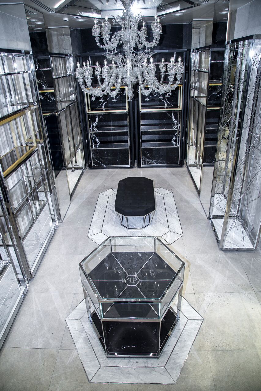 The boutique is a further example of the new Philipp Plein retail design concept, developed together with Milanese architects AquiliAlberg. Marble blocks and steel accents produce contrasting elements of shadow and light to present a refined yet impactful ambiance. The gallery style layout and luxurious materials are meant to display the pieces as precious works of art.