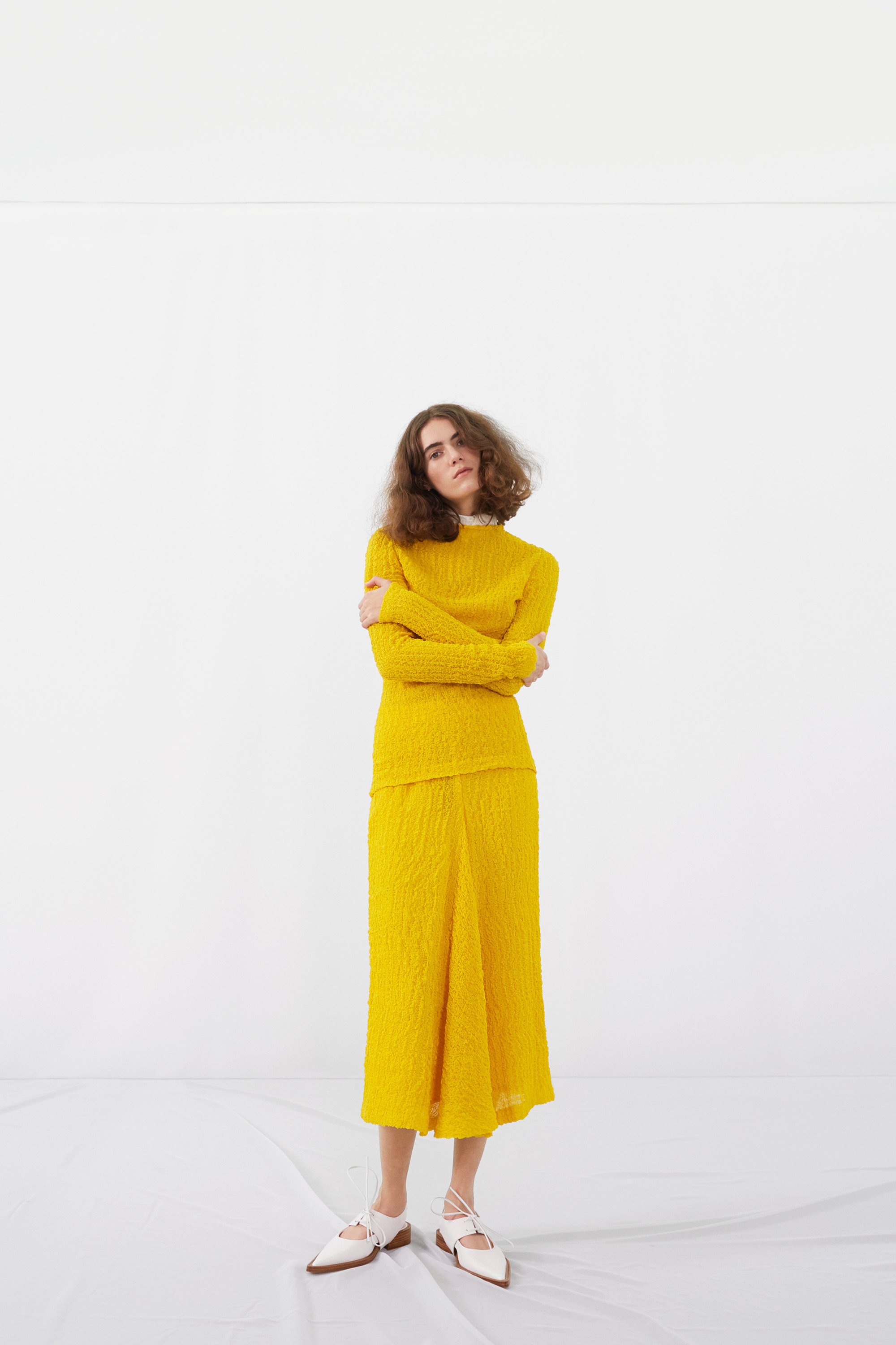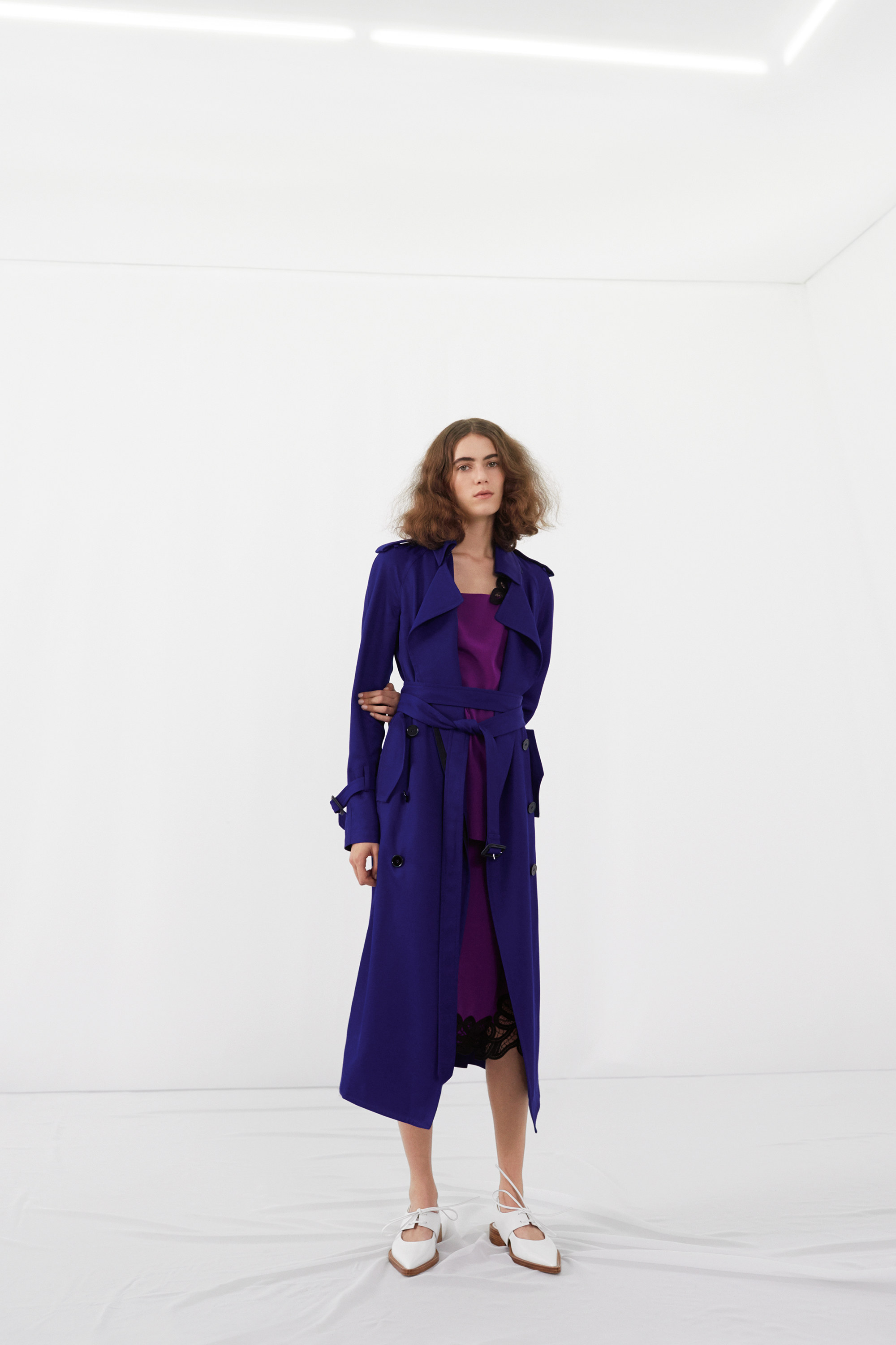 The presentation was a strong showing on separates for pre-fall, the most sensational was a trench coat in a vivid shade of ultramarine blue.