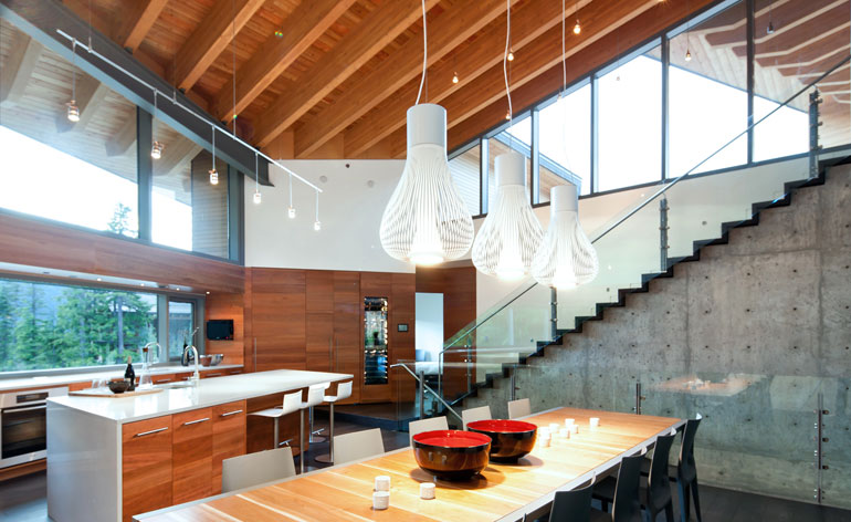Architects David Battersby and Heather Howat of Vancouver-based firm Battersby Howat designed a spectacular, private villa in a growing neighborhood above the resort community of Whistler. The villa’s voluminous size is belied by the surrounding bedrock which was strategically blasted to envelop the house making it seem as if a substantial portion is below grade.