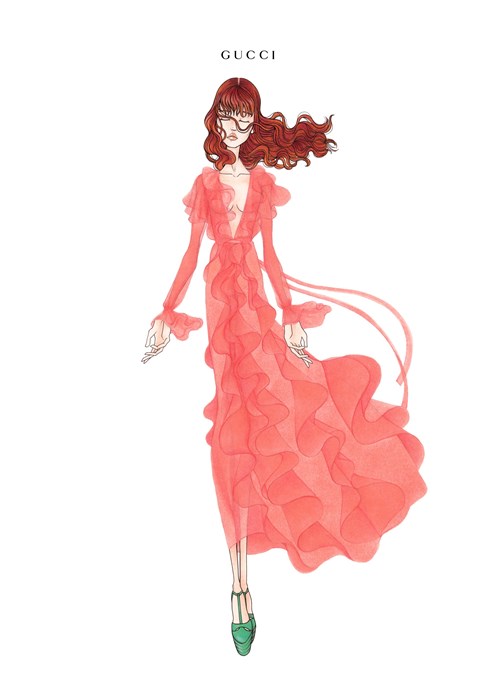 Last week on twitter Alessandro Michele released three illustrations of the gowns he intends to create just for his muse. The illustration’s diaphanous gowns closely project the bohemian spirit one associates with Florence’s style and mood.