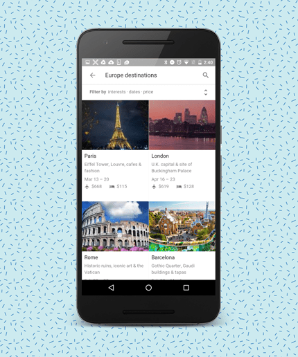 Next time you open Google on your phone, try a search term like “Caribbean destinations” or “Europe destinations”—using the word “destinations” is what will pull up the new feature. You’ll get a series of information cards on various cities, presented in order of popularity (as determined by search volume and location data). And that’s step one!