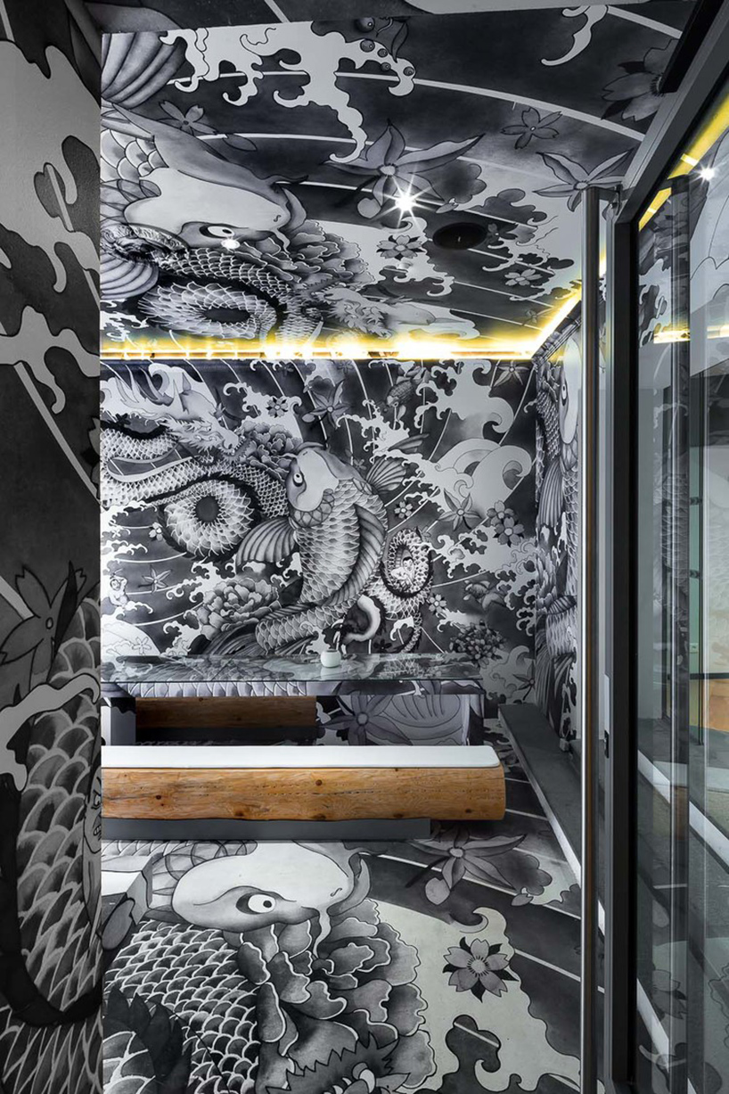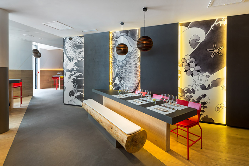 New on the scene is Koï located in Aix-en-provence, a city in the south of France. The restaurant designed by architect Vincent Coste is a Japanese restaurant influenced by yakuza tattoos. Inside the restaurant are large monochromatic illustrations that depict the Japanese fish of the same name. The graphics, designed by Claire Leina, envelop the floor, walls and ceiling of the restaurant.