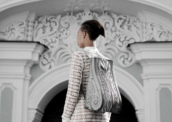 The Drama collection by Kiev-based designer Kofta is a series of satchels modeled after architectural elements. Kofta’s desire to create a new beauty “by our own hands, as an act of compassion” is as much for the art of creating fashion as it is for remembering the beauty of craftsmanship from the past.