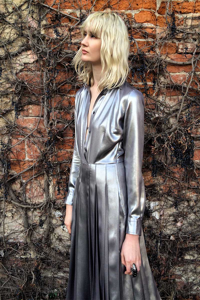 The Melampo collection takes a gentle look back to the baroque period, from Italy to Berlin, via an esoteric mixture of transparent lace, impalpable laminated silk, lurex georgette and soft wool muslin fit to express the eclectic fashion of the Berlin savoir-faire.