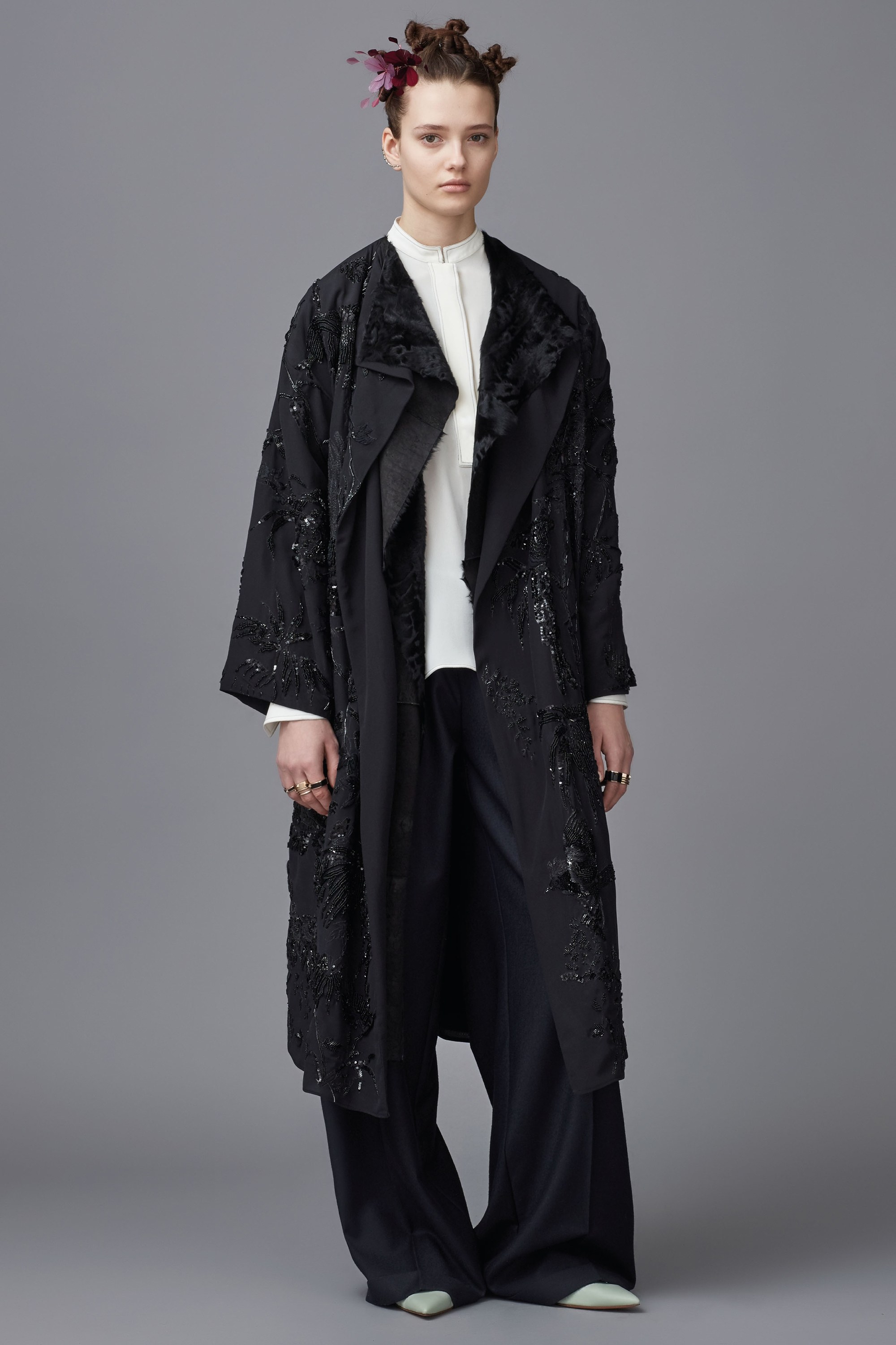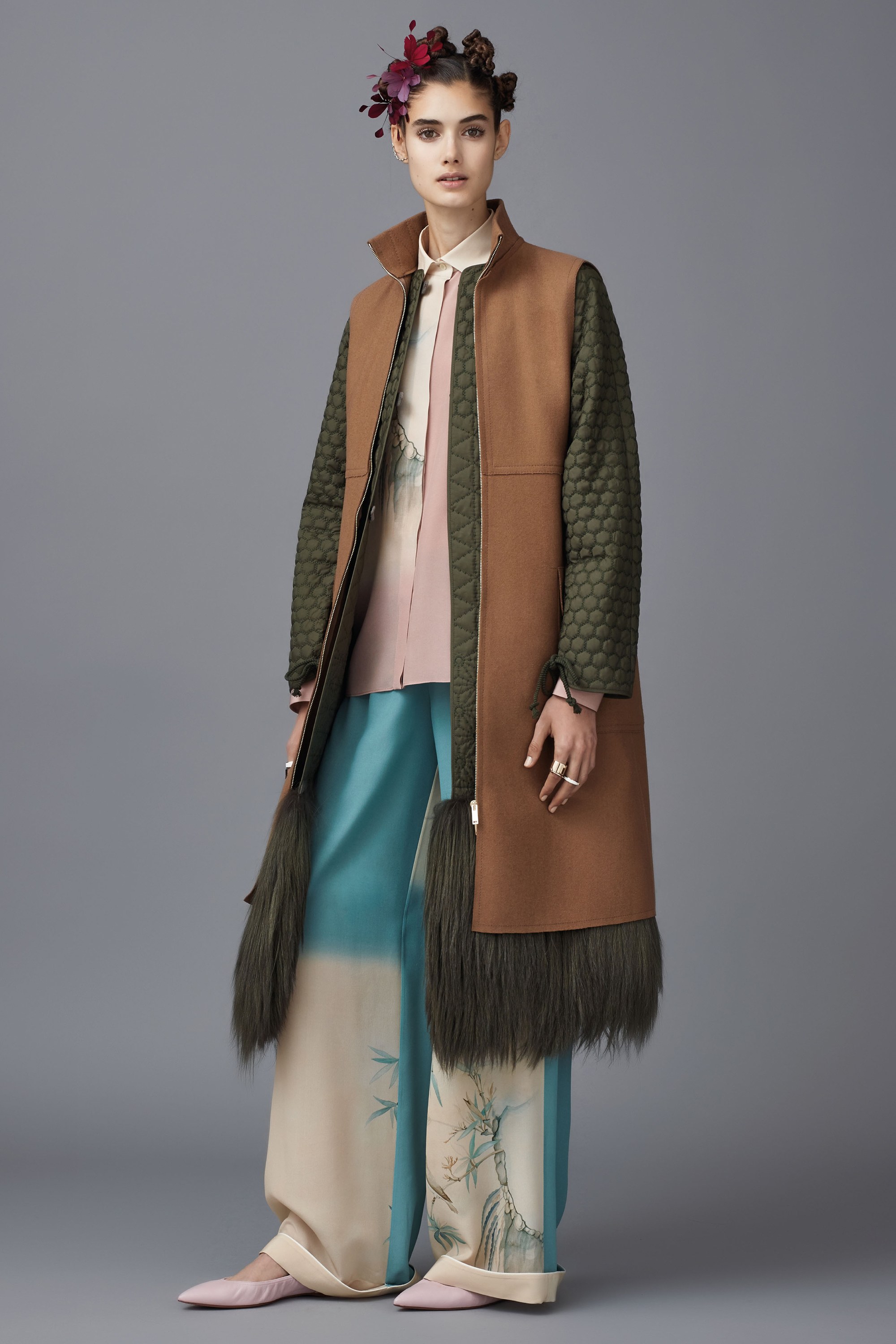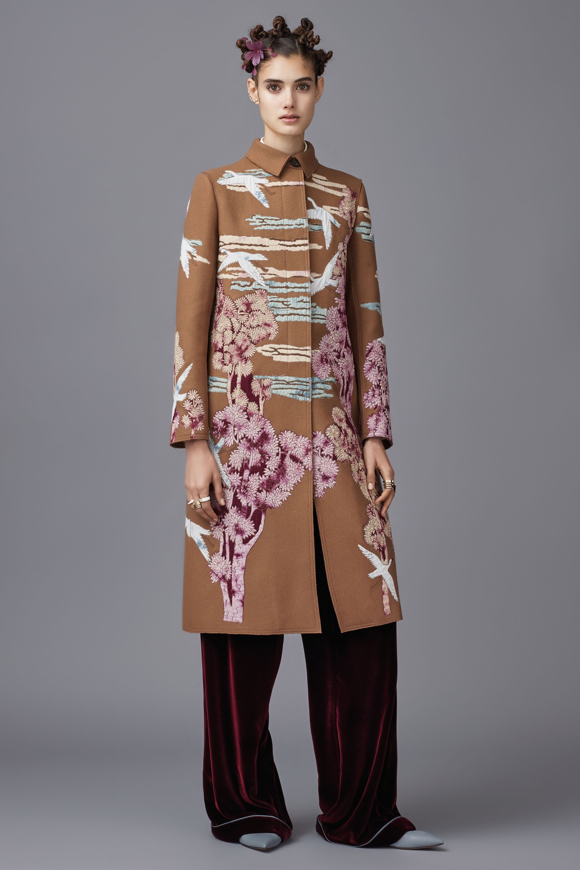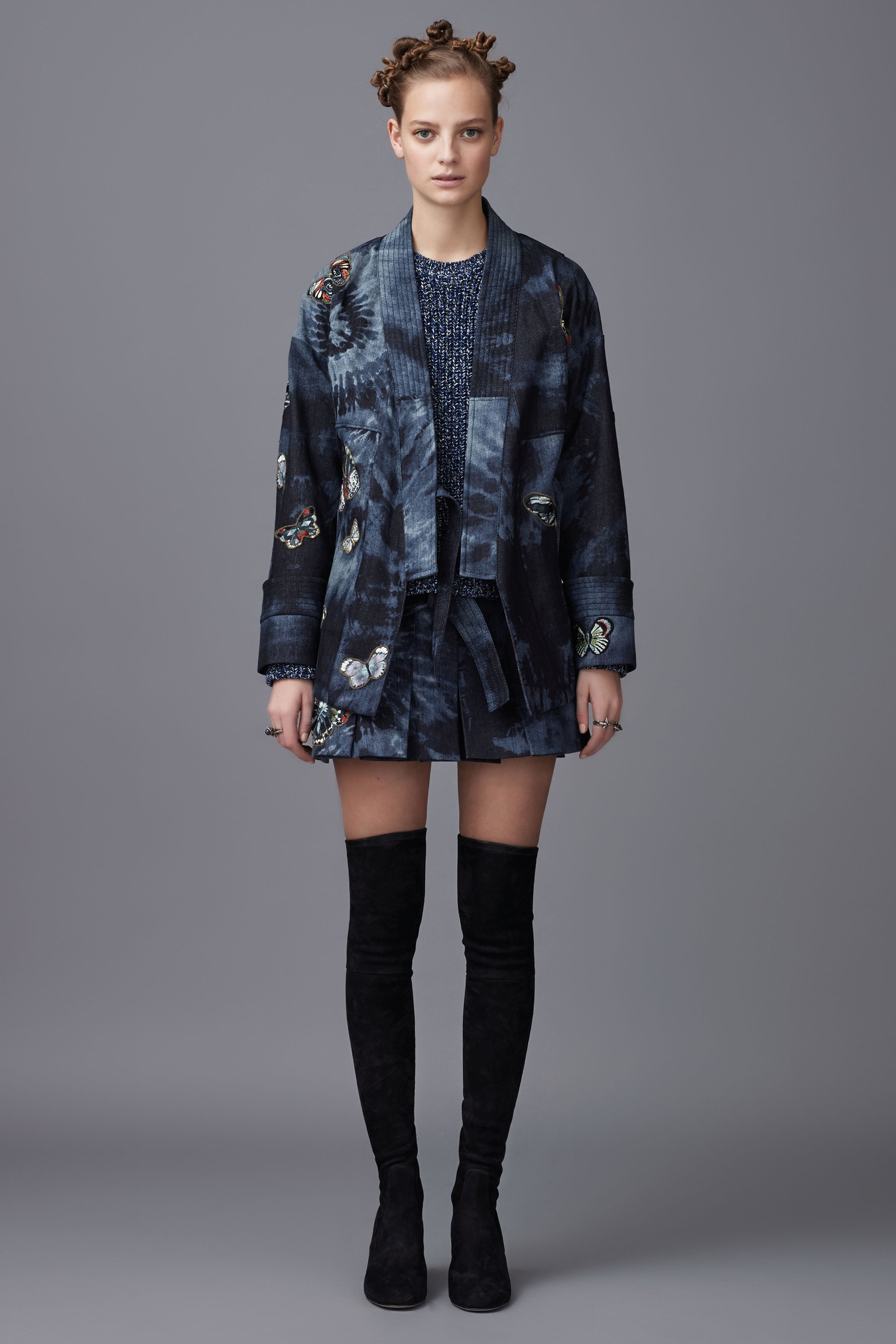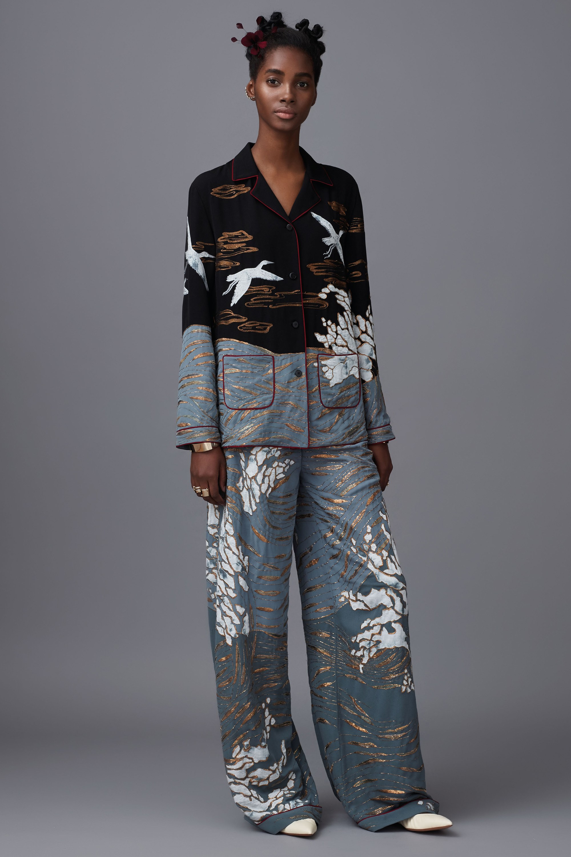 Of course tie-dye is only the opening act of the pre-fall 2016 collection. Bamboo prints turn up on simple long-sleeved dresses, pajama sets, and button-down and pleated skirt combos. In fact there is a lot of cross-print-technique pollination with an emphasis on neutral hues and humble wabi-sabi embroideries of cherry blossoms, clouds, and flying birds on outerwear featuring traditional quilted linings.