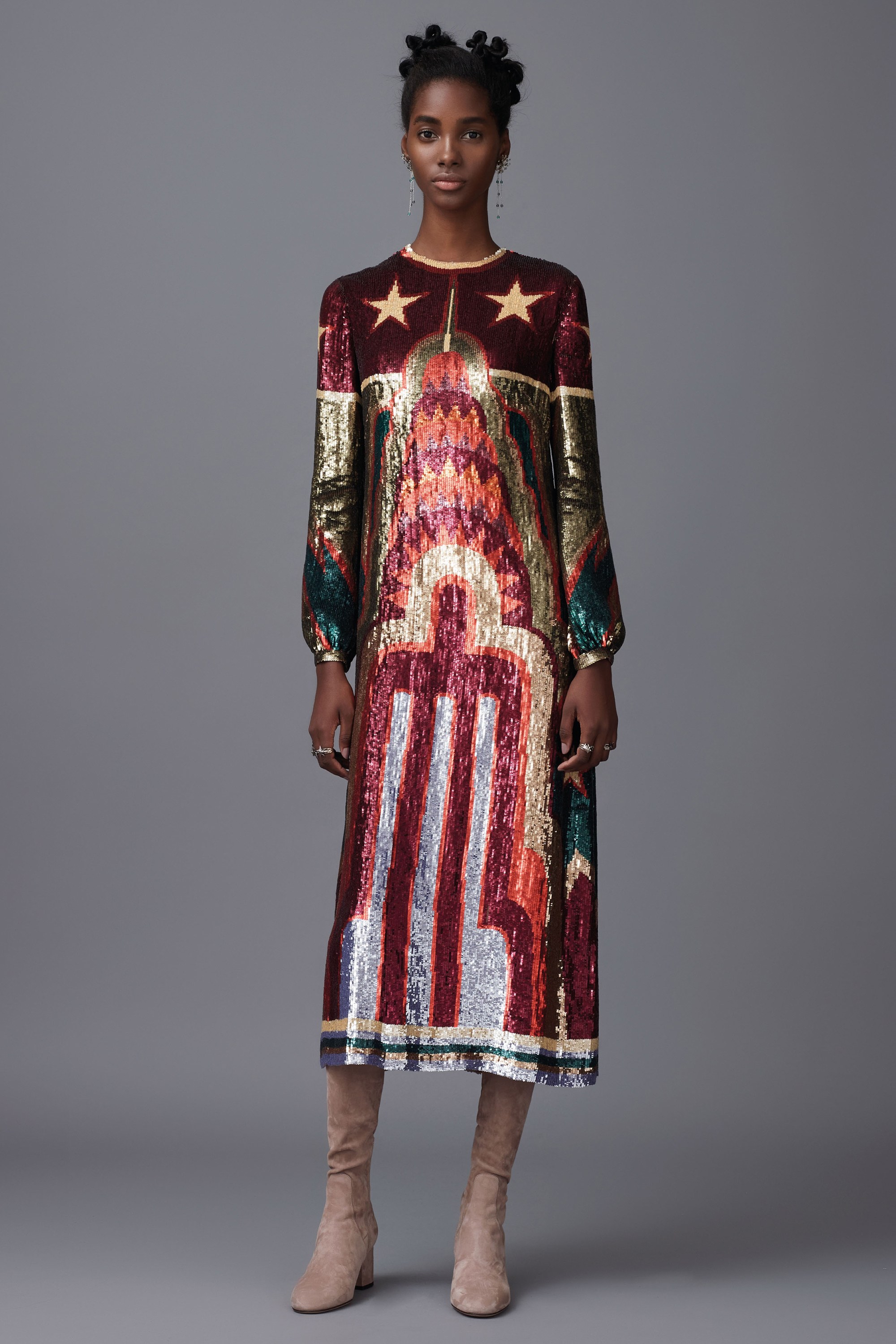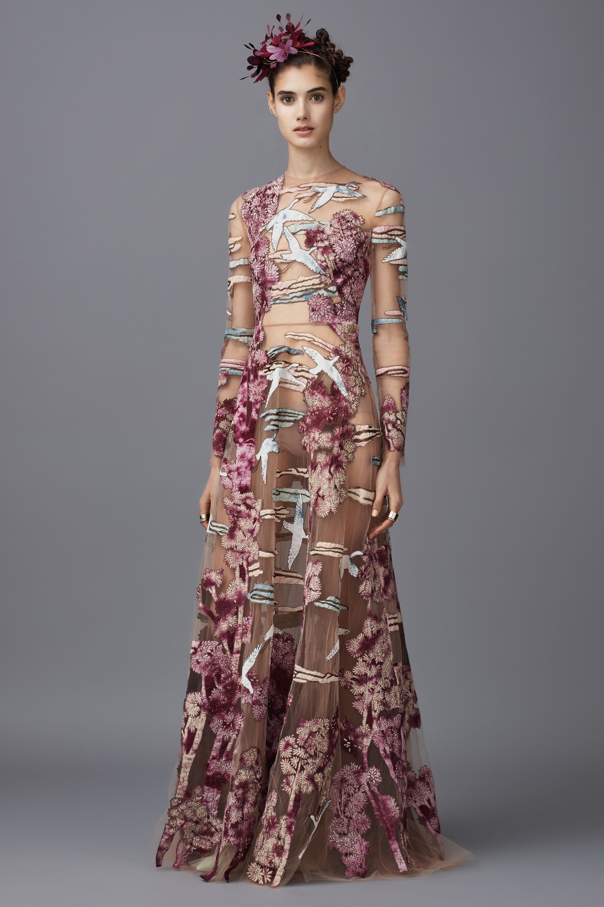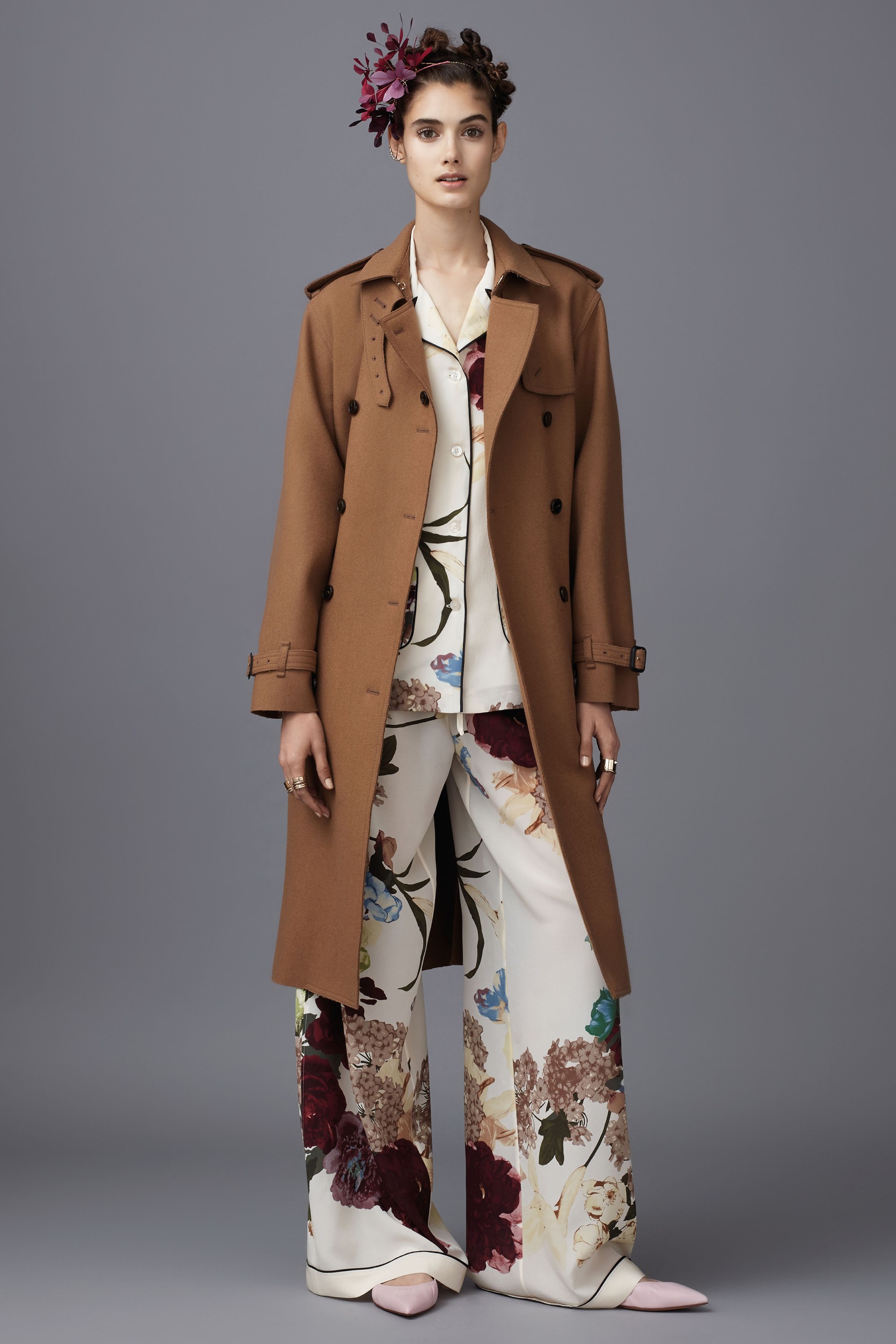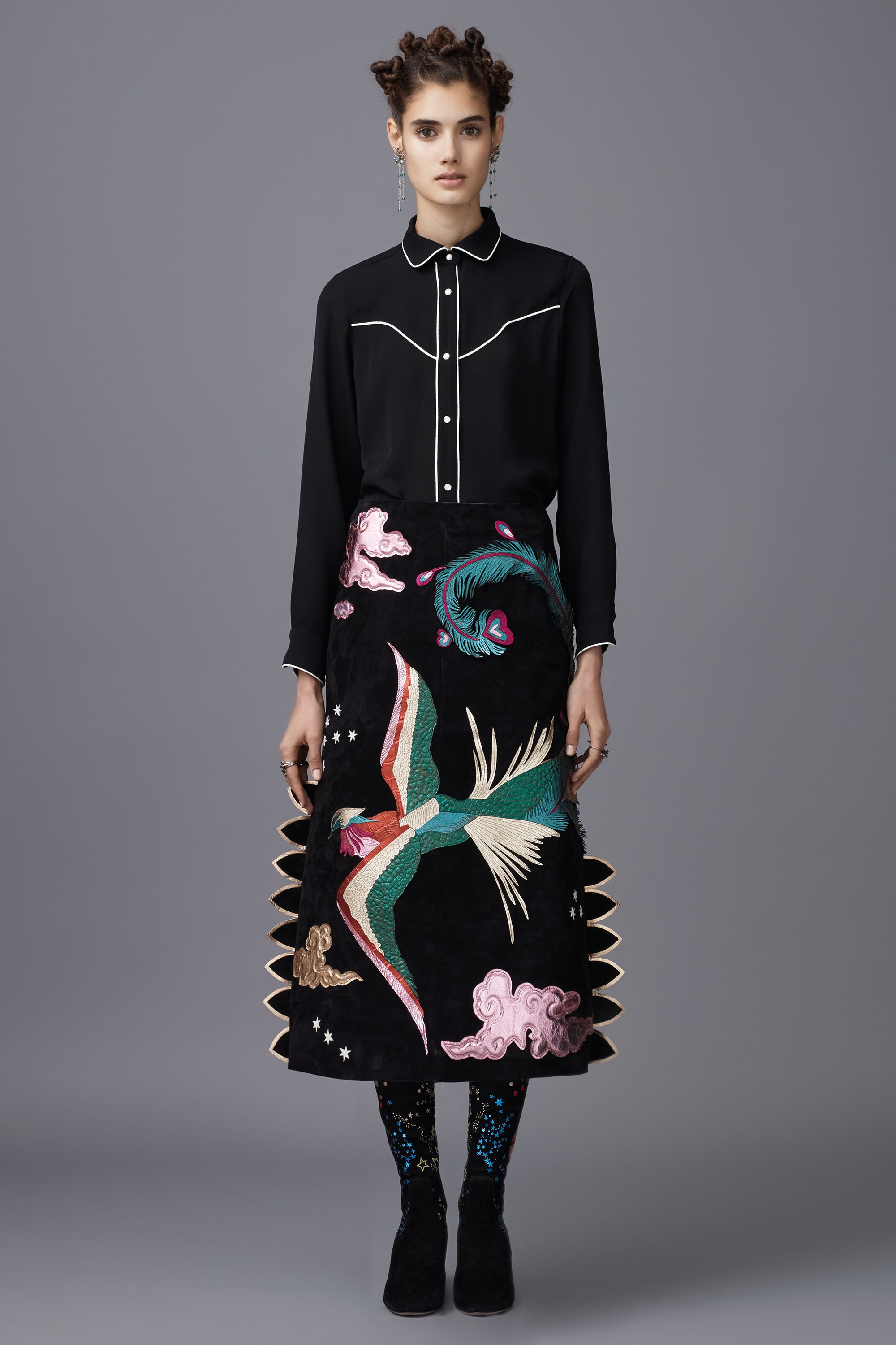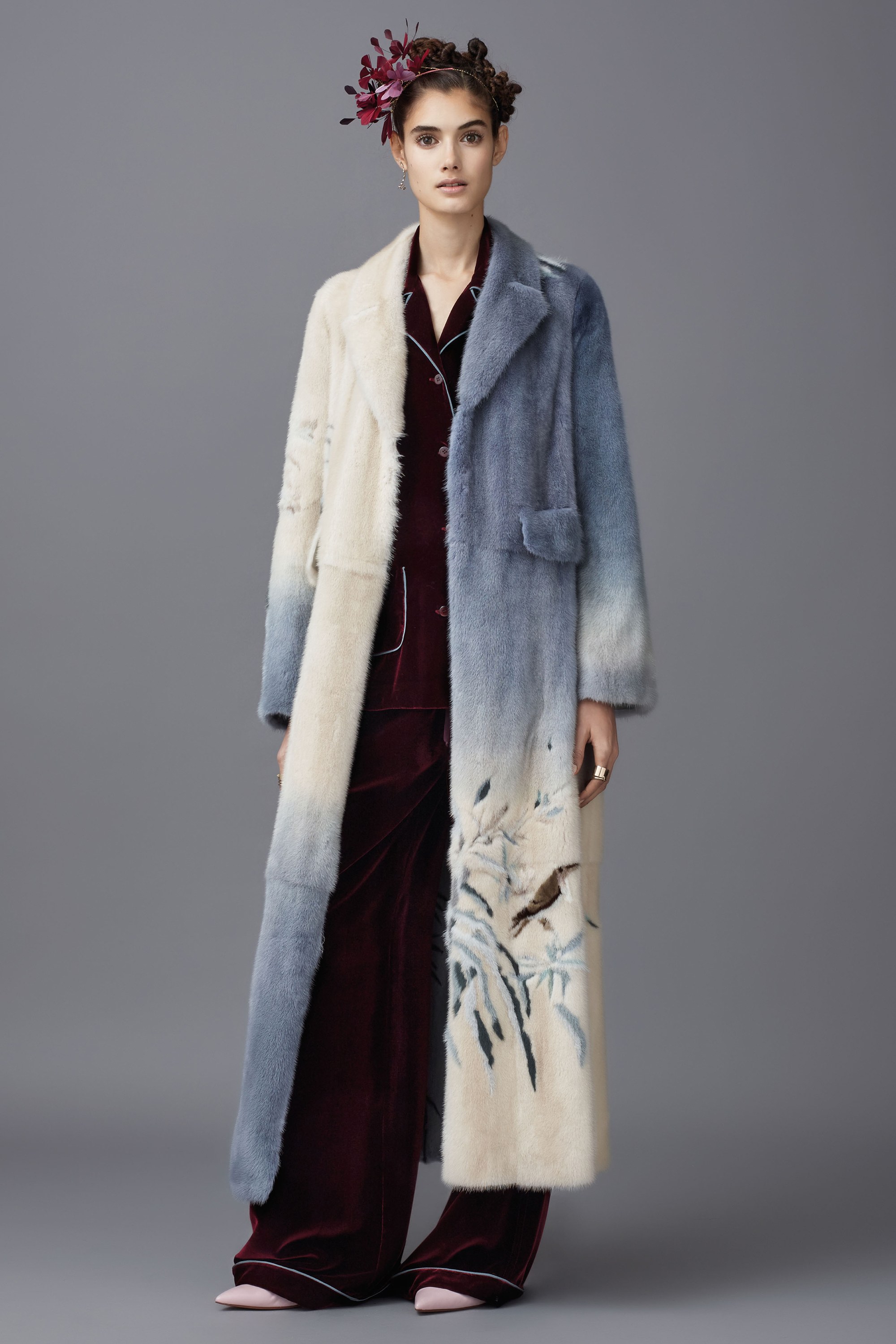 Of course tie-dye is only the opening act of the pre-fall 2016 collection. Bamboo prints turn up on simple long-sleeved dresses, pajama sets, and button-down and pleated skirt combos. In fact there is a lot of cross-print-technique pollination with an emphasis on neutral hues and humble wabi-sabi embroideries of cherry blossoms, clouds, and flying birds on outerwear featuring traditional quilted linings.