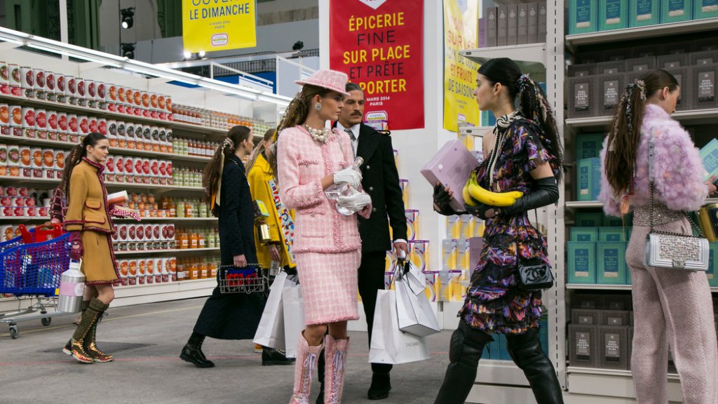 But Karl Lagerfeld for Chanel produces the most talked about shows. Two epic themes are the Chanel airport created for the Spring 2015 collection, or more recently, the Chanel supermarket which featured rows and rows of “Chanel” household goods.