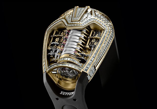 The crown jewel of this incomparable timepiece is the design. The entire case looks like a LaFerrari engine bay, with the mechanical movement inside representing, of course, the engine.