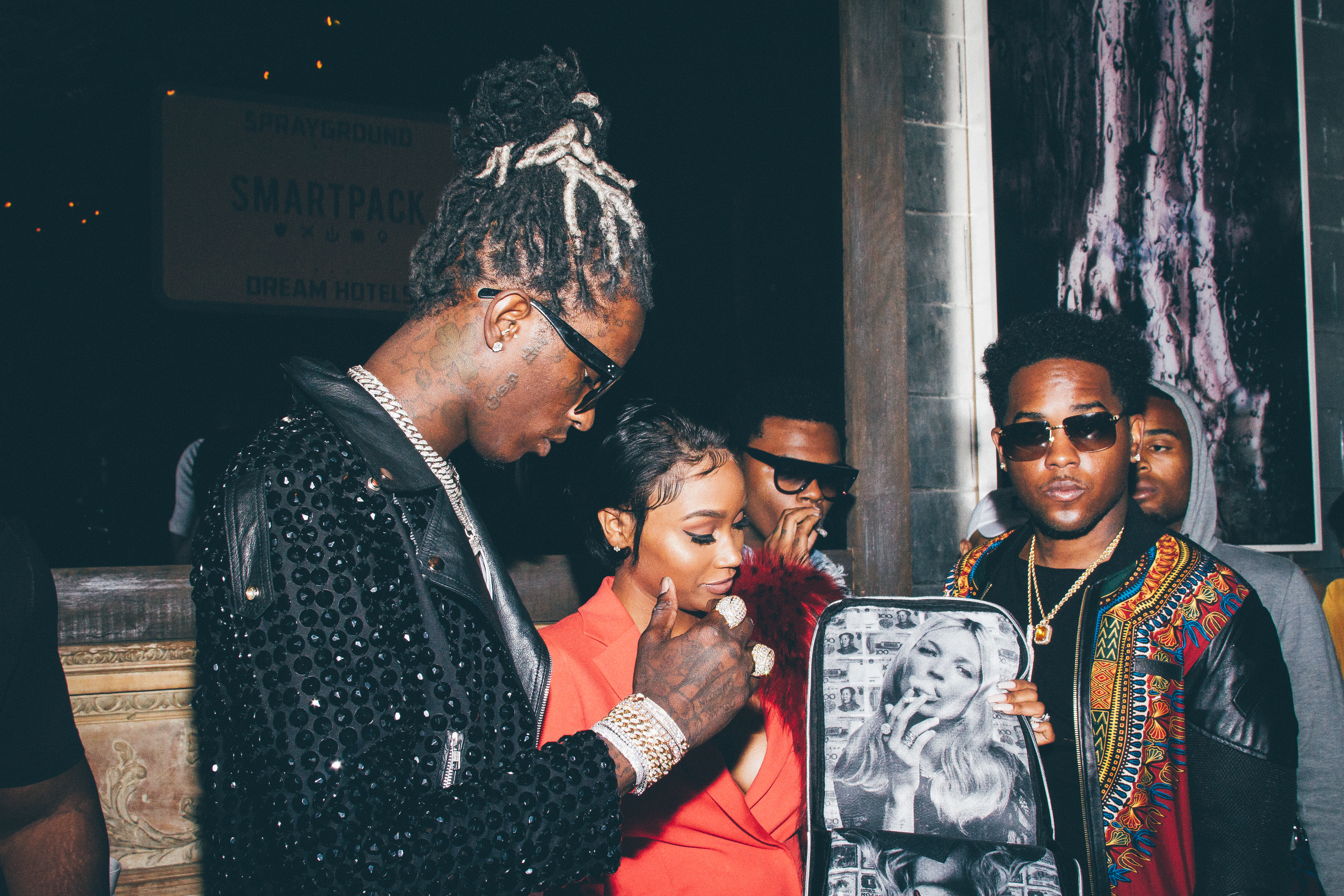 Last night, Sprayground and the Dream took over the hotel’s underground nightclub Electric Room and it’s loading dock to celebrate the collaboration and debut the fashion centric line of bags. Young Thug immediately gravitated towards the Sprayground bag featuring fashion icon Kate Moss.