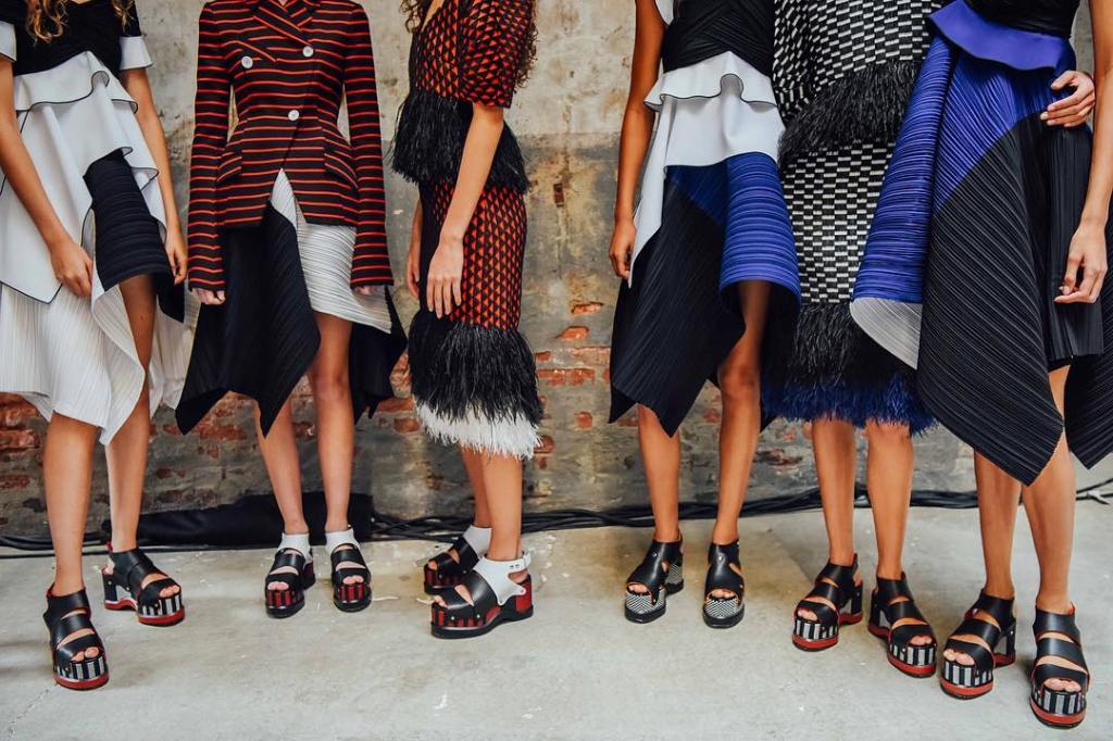 McCollough and Hernandez Proenza Schouler spring 2017 collection took on a vintage edge. The brand’s heritage handcrafts extended to Japanese style pleating which they whipped into three-dimensional dresses and skirts. The bright palette included sharp colors, patterns and check striped dresses with ostrich feathers and woven leather strips onto fabric.