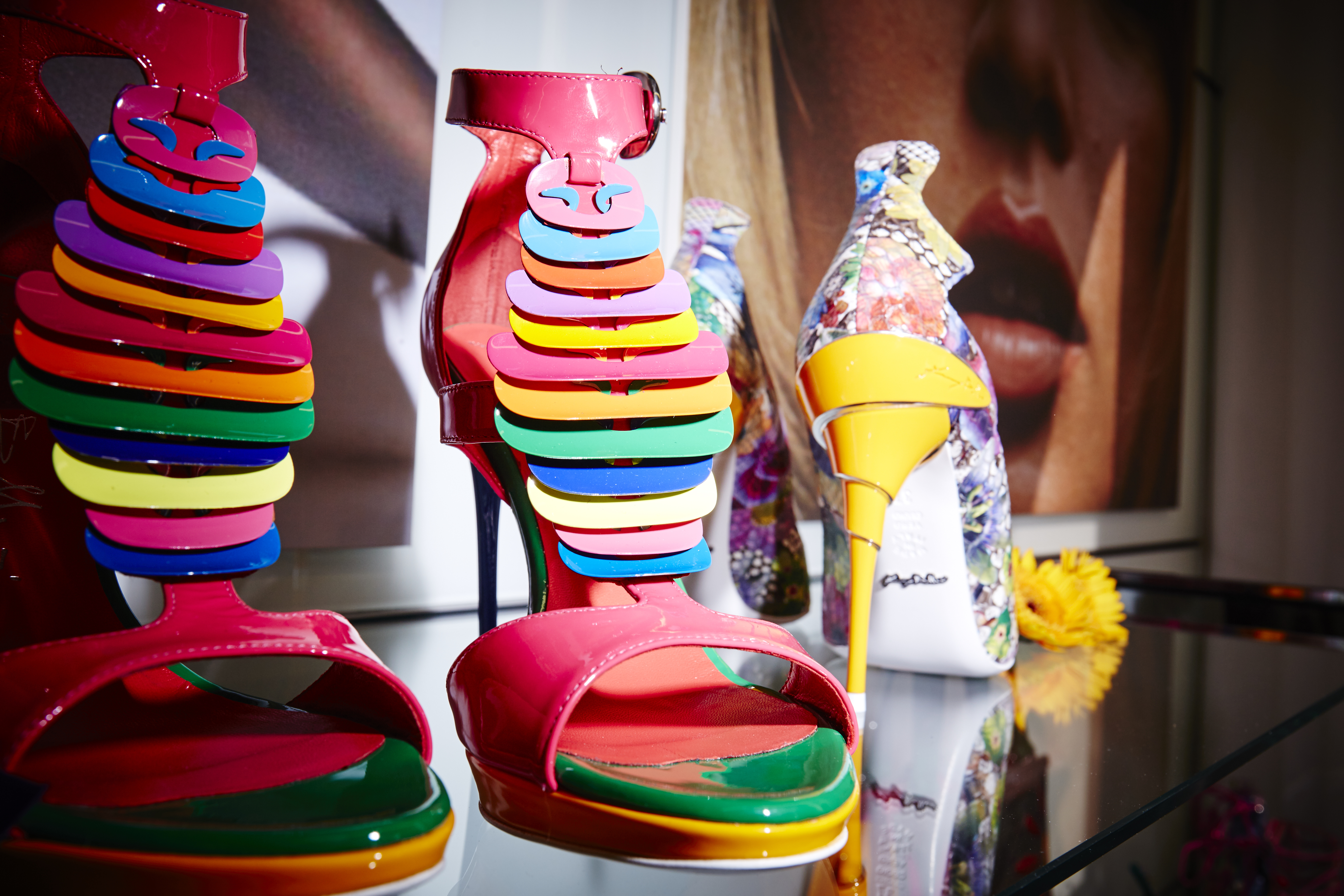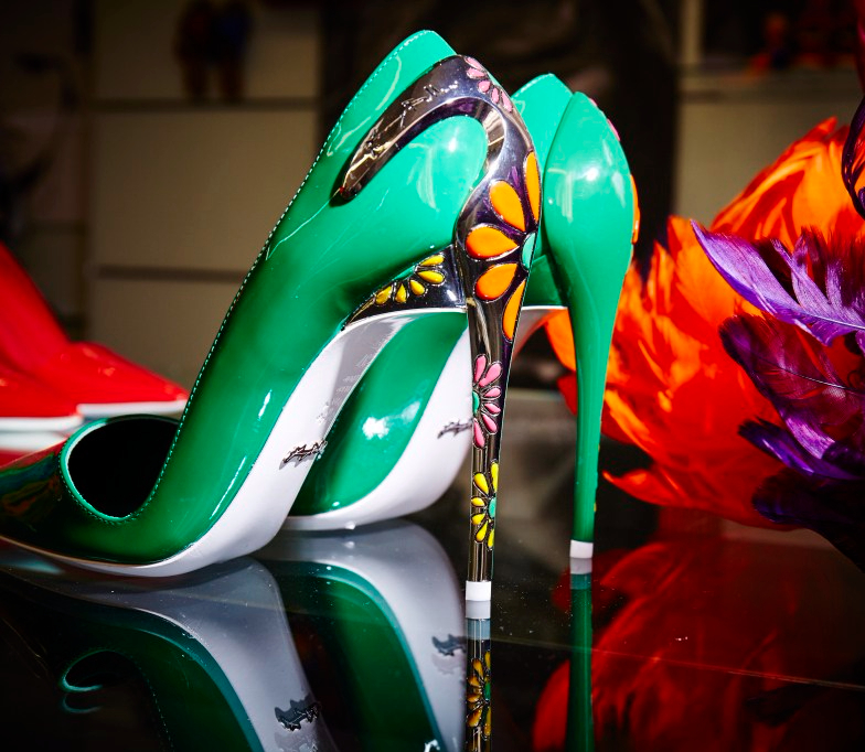 Bardot’s smooth, femme fatale eroticism takes the shape of colored-lacquer courts with mirror heels and floral design; the novel crocheted leather envelops the sandal’s upper, showing off the ankles and creating a seductive, beguiling look.