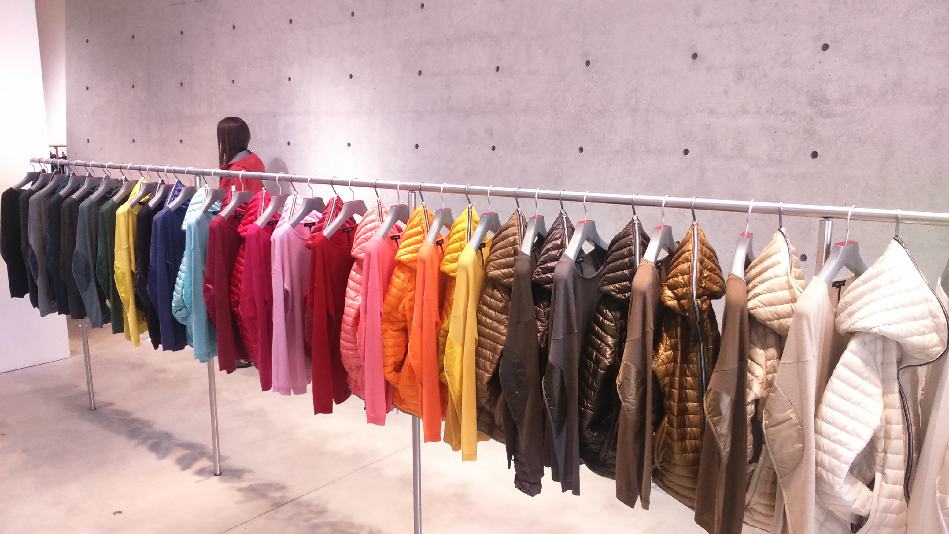 Duvetica’s new collection shown at women’s fashion week was presented inside the brand’s great showroom. The concrete cave lined with sleek track lighting and marble flooring was the perfect backdrop for the rainbow of feather-light jackets and vests which lined the walls.