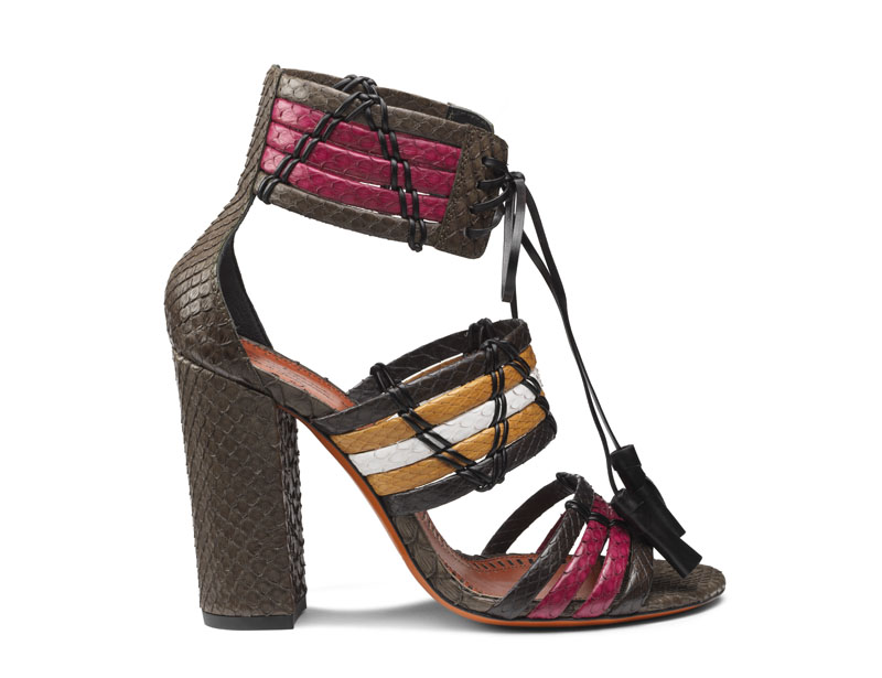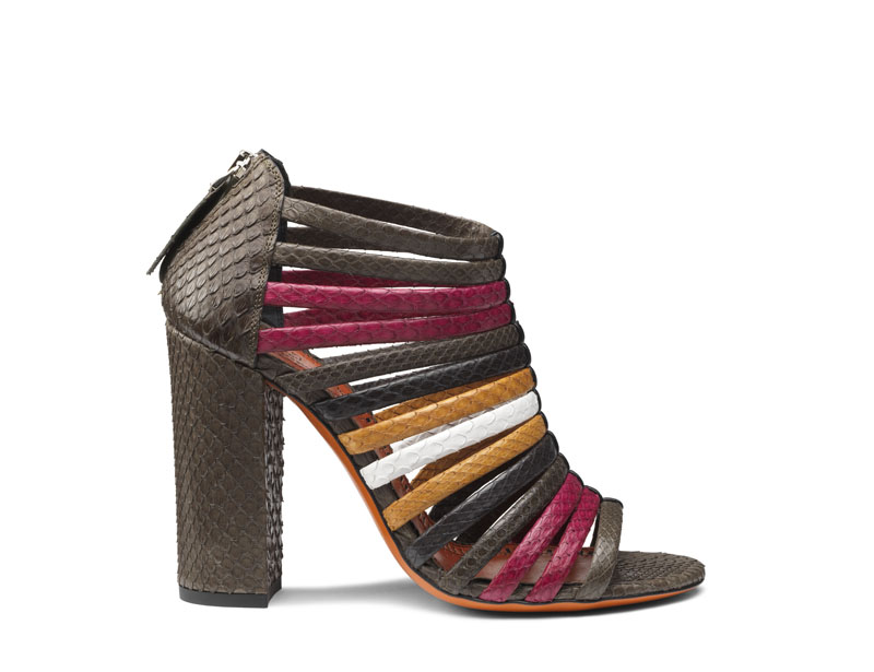 The amalgamation of dense shades of green, amber, brown, ultraviolet and lobster red creates a sumptuous chromatic texture. Materials are precious: python, suede, calfskin.