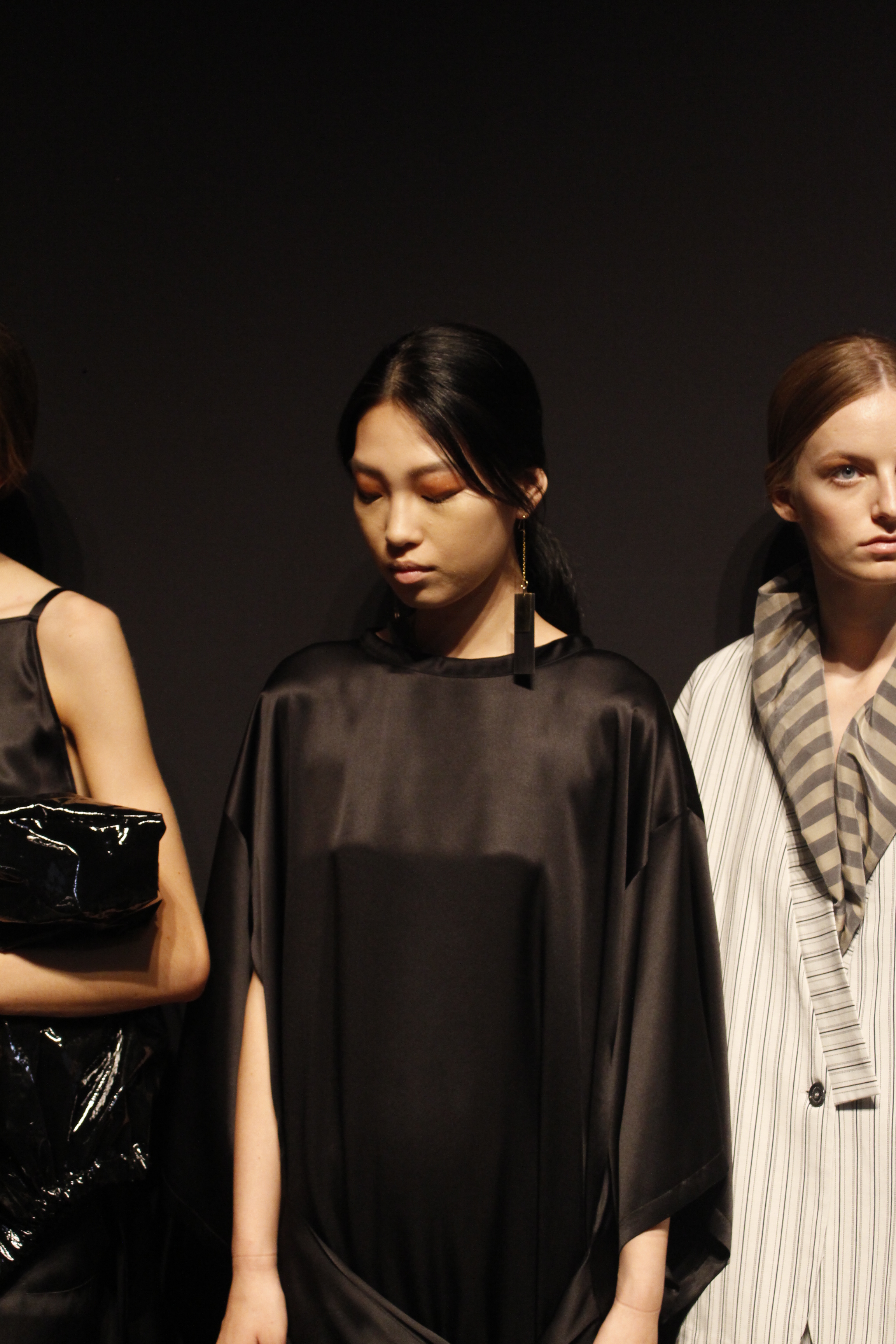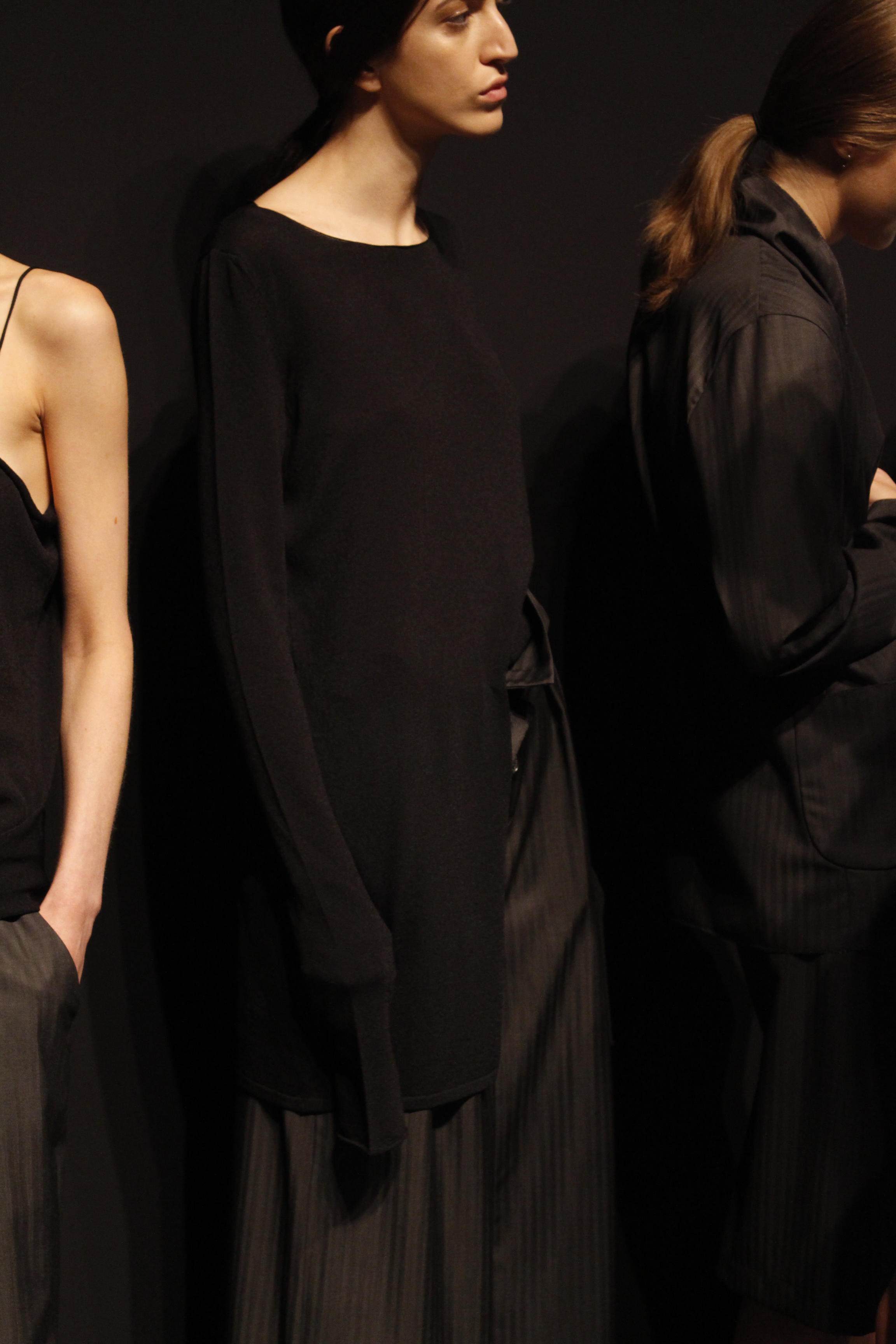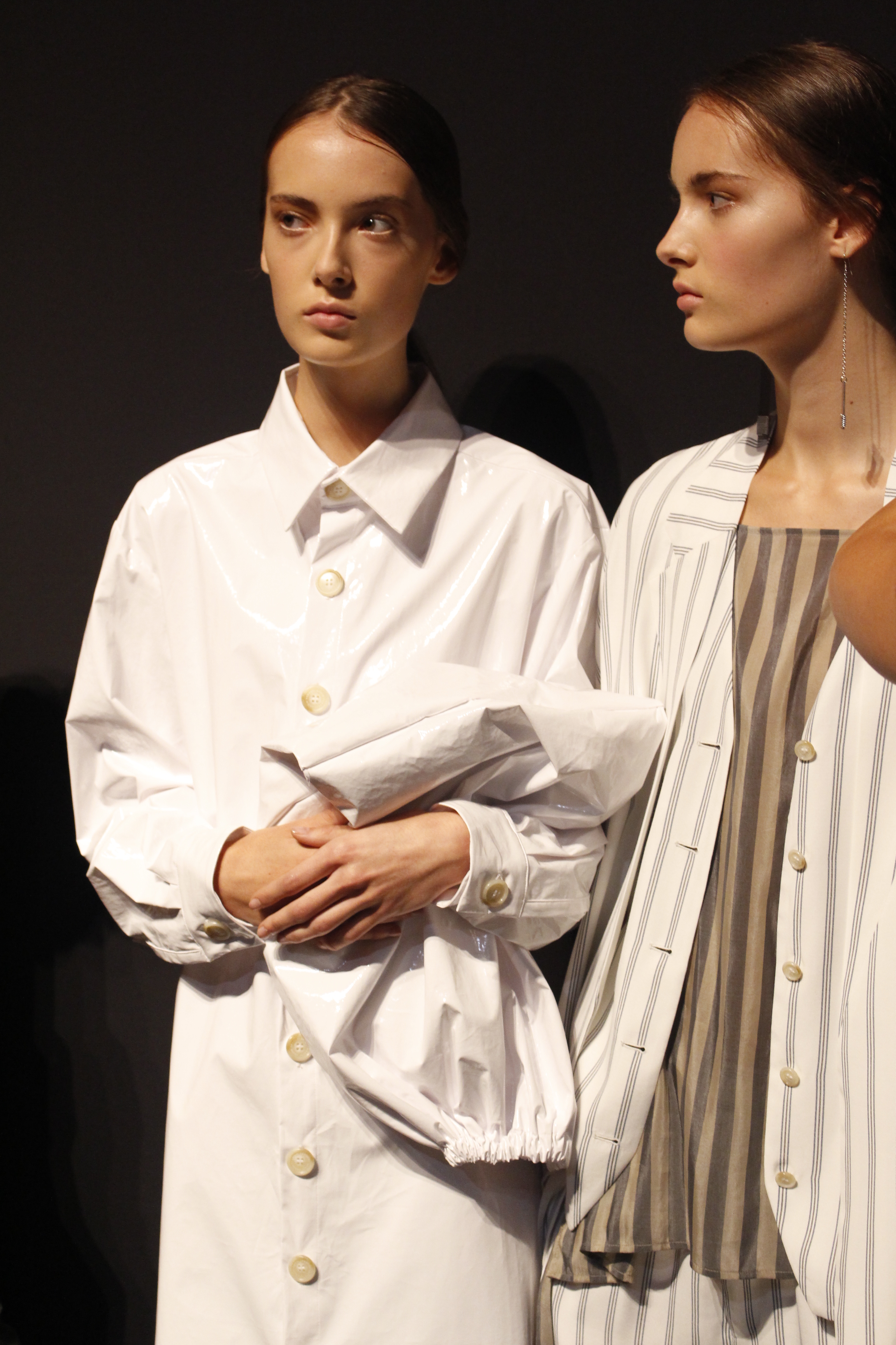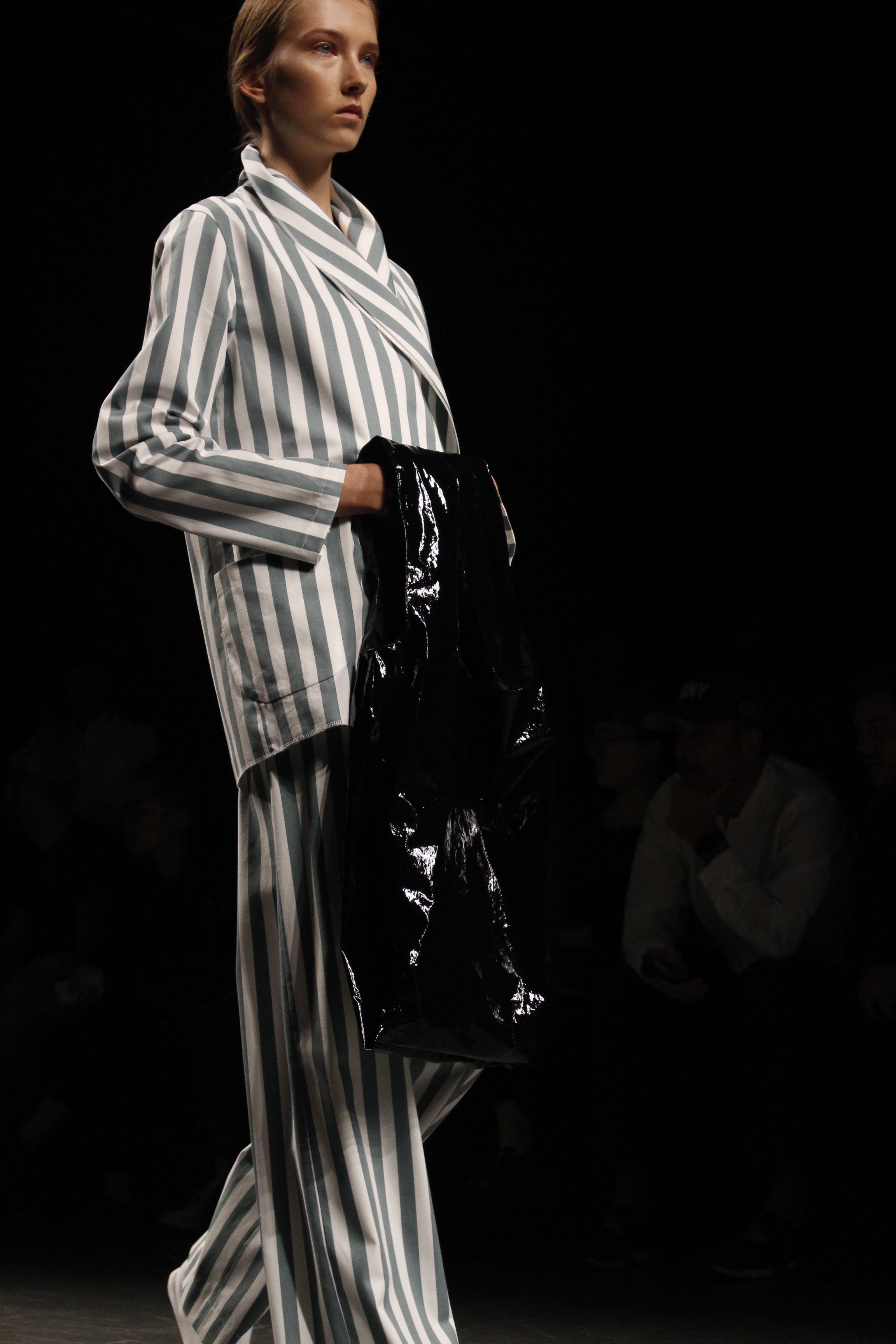 The pragmatic textures of drill, light denim and woven canvas are used for trench coats and masculine-like kimonos and aprons. Viscose, silk and mako jersey make a brief appearance in stunning pinstripe suiting and in buren-inspired bold woven canvas.