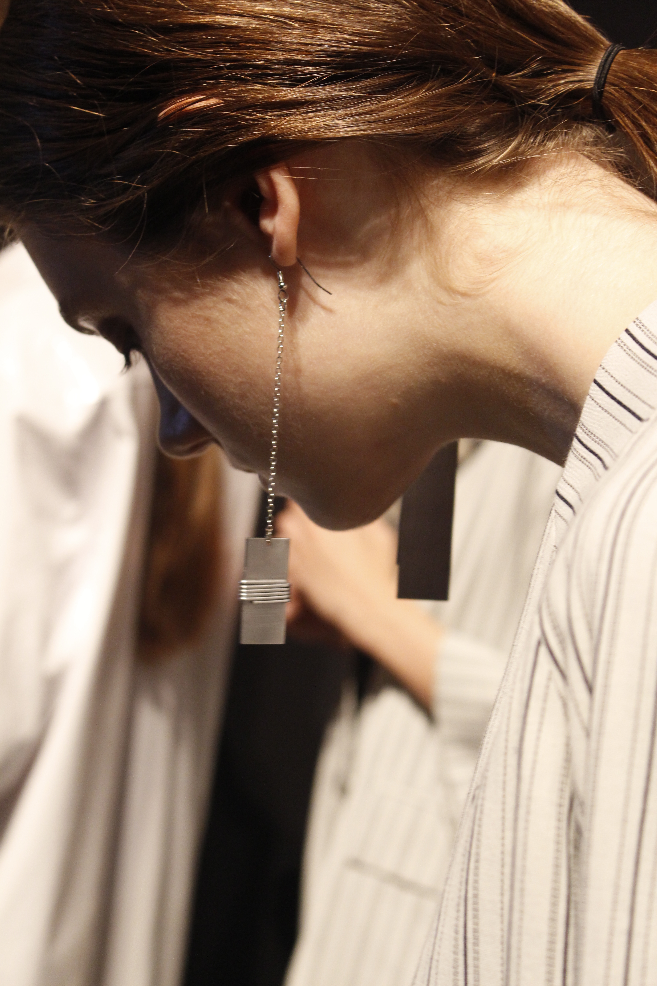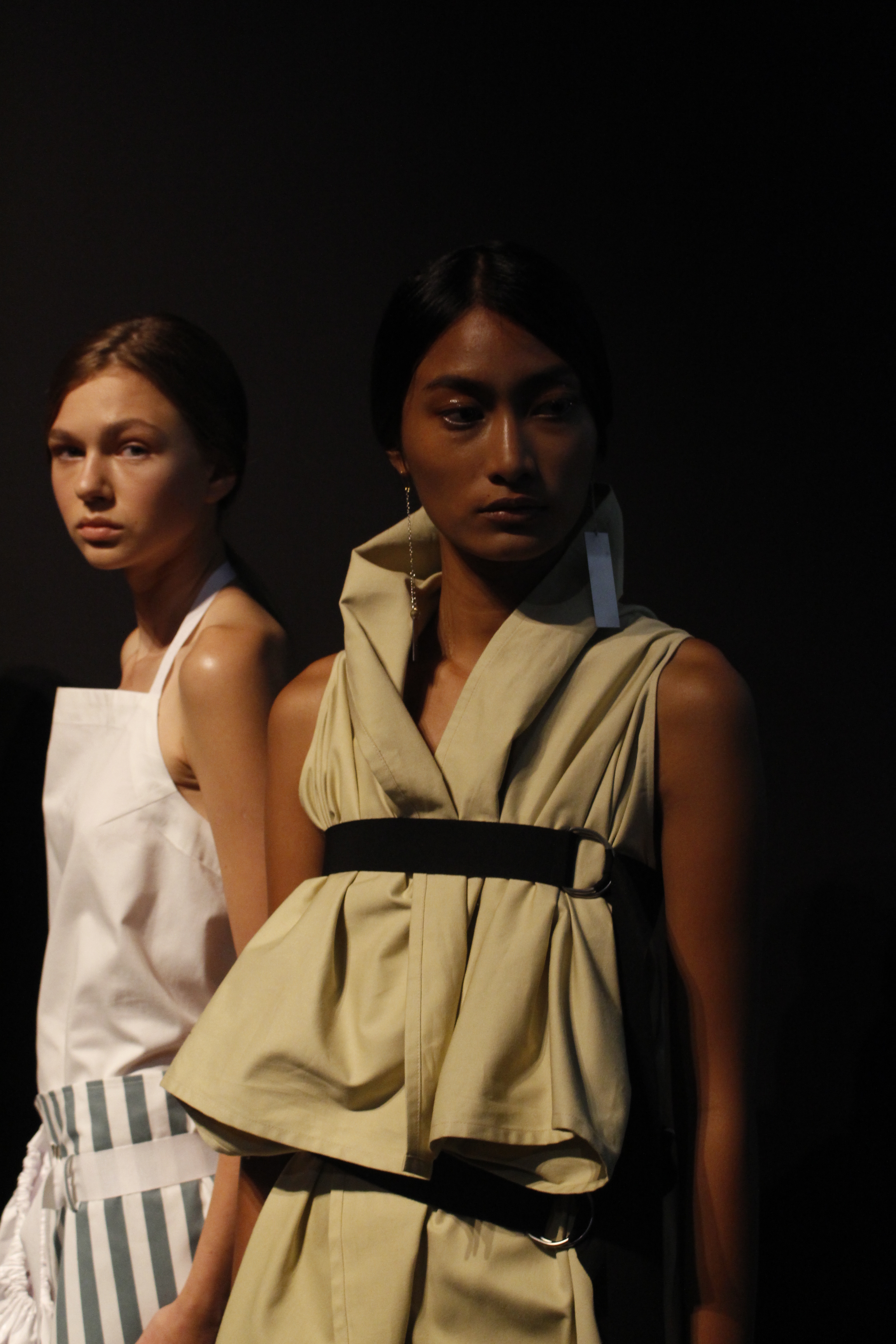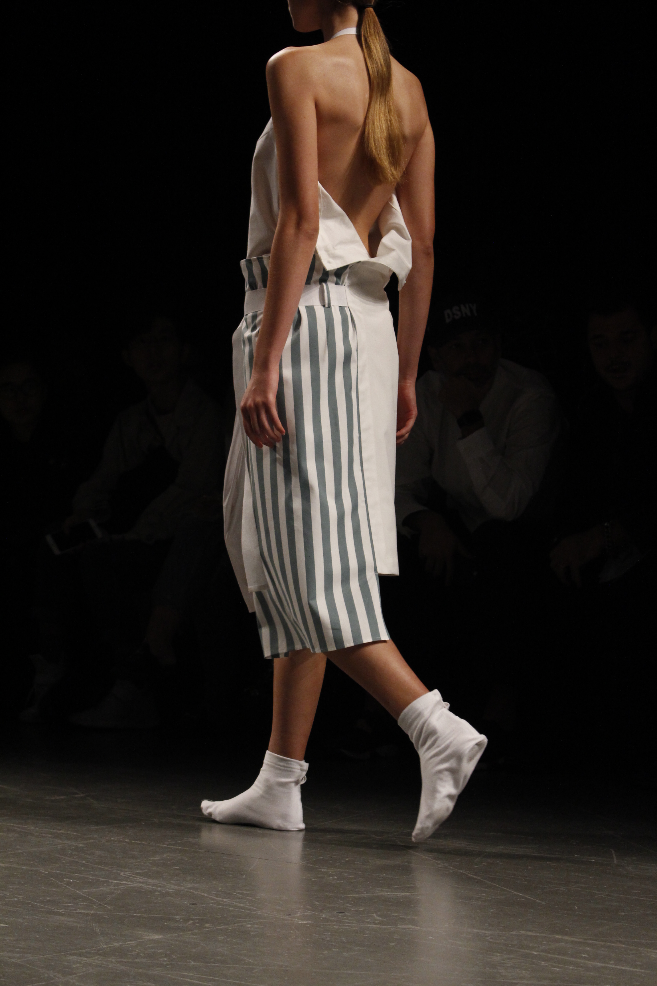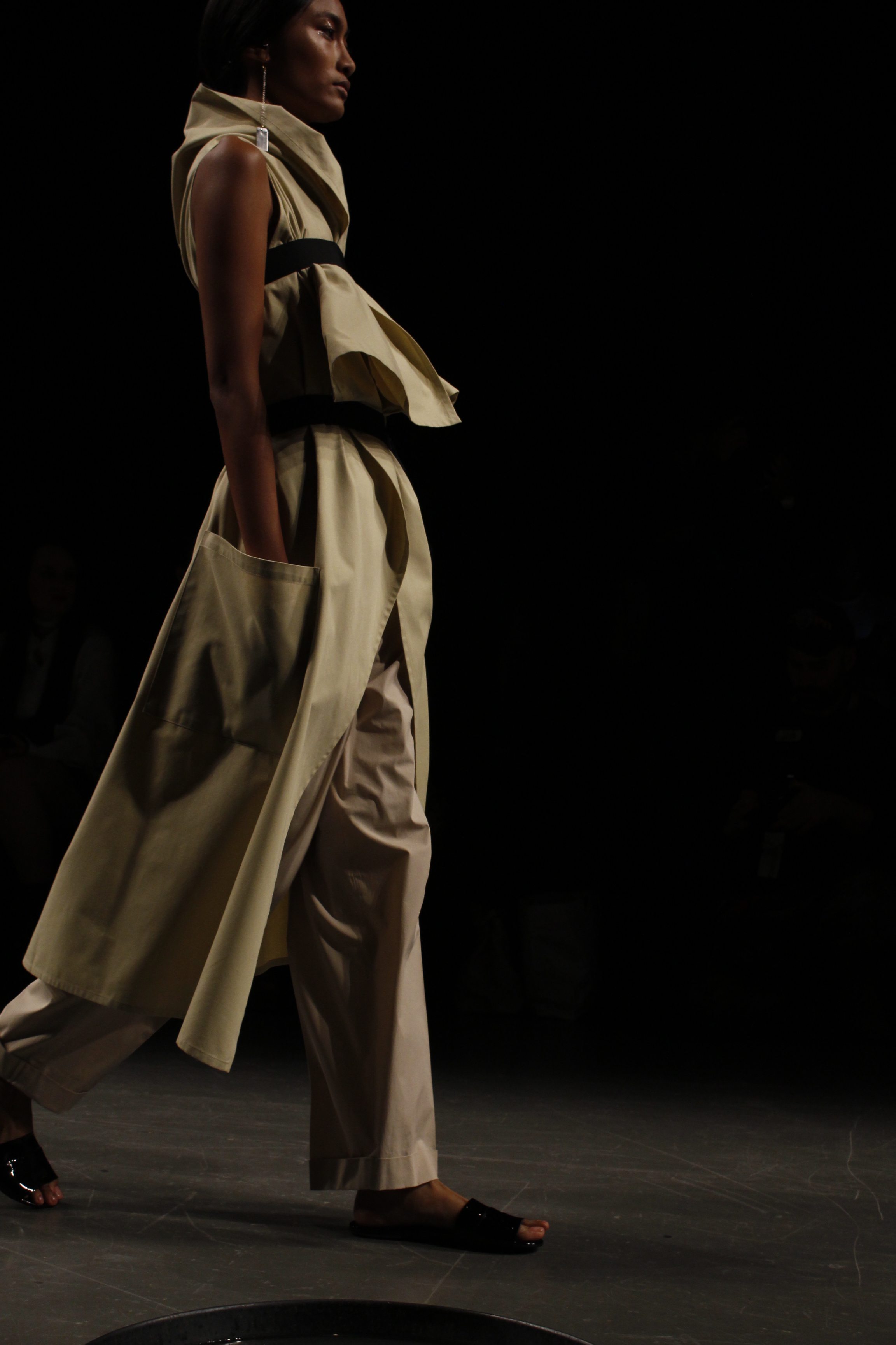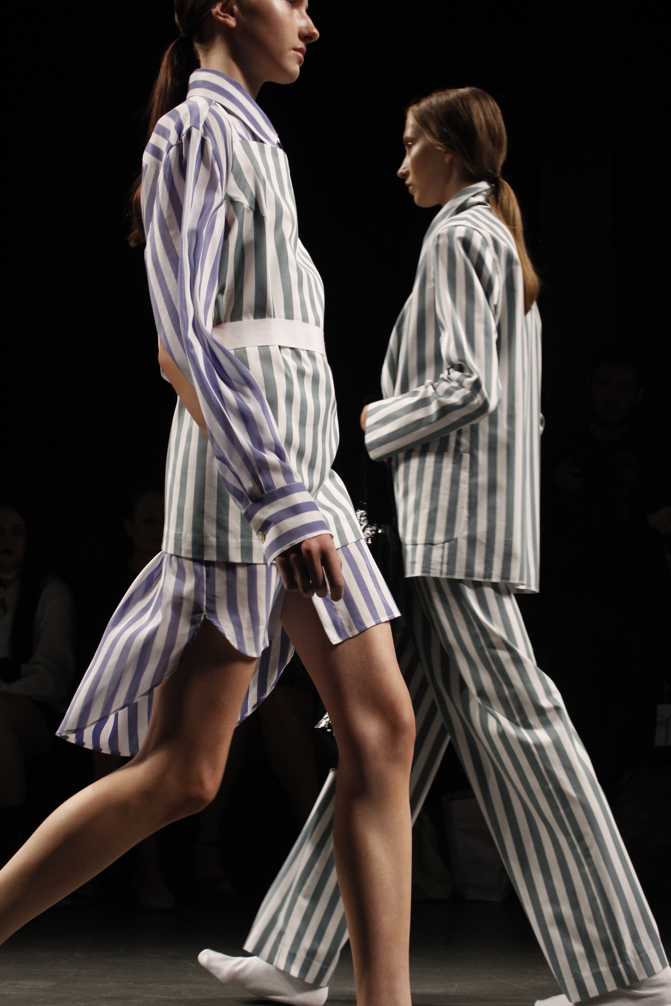 The pragmatic textures of drill, light denim and woven canvas are used for trench coats and masculine-like kimonos and aprons. Viscose, silk and mako jersey make a brief appearance in stunning pinstripe suiting and in buren-inspired bold woven canvas.