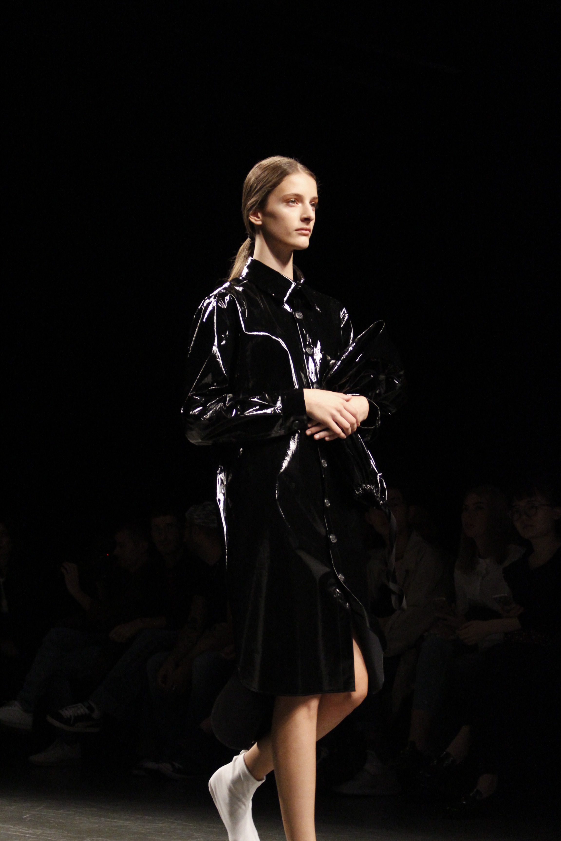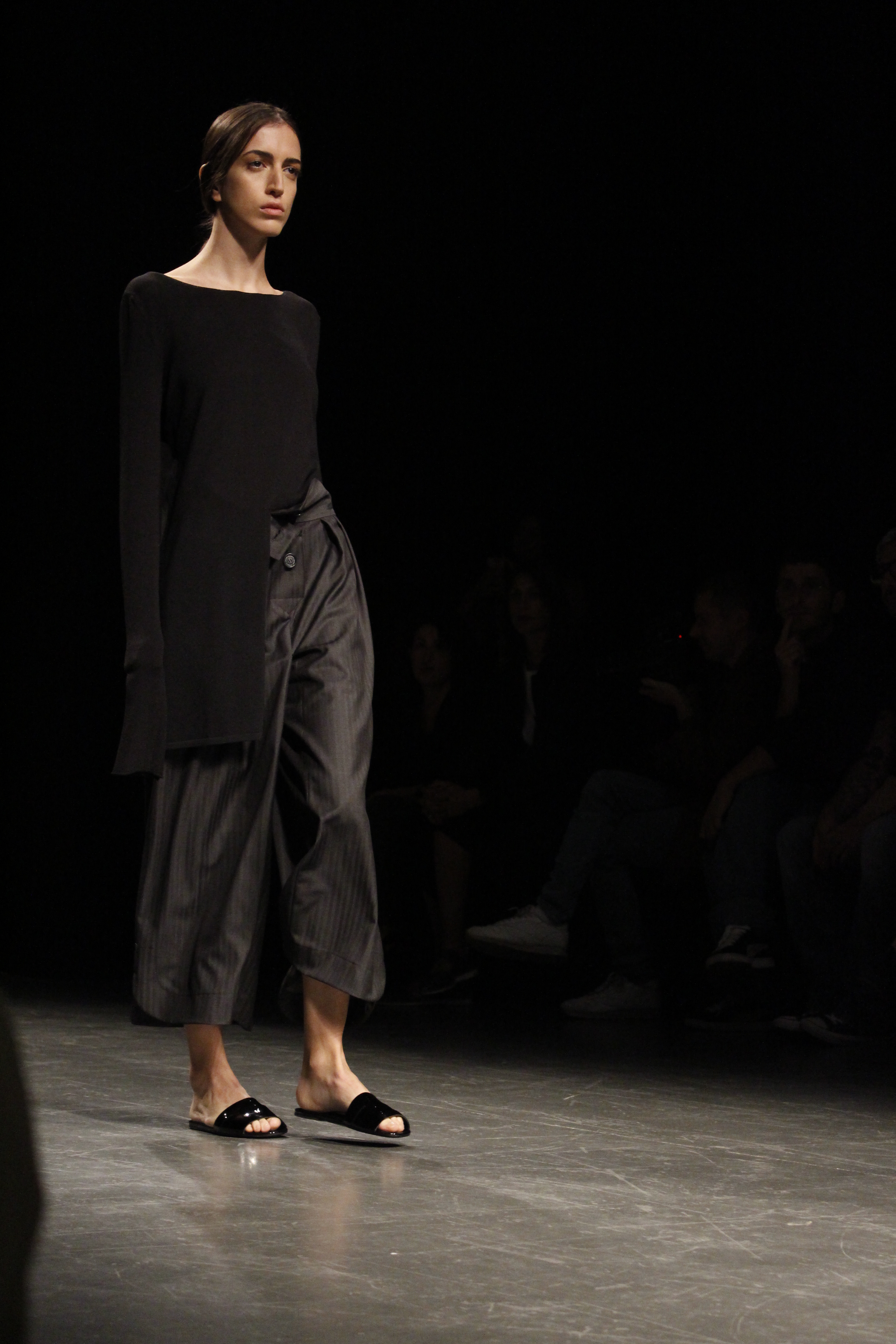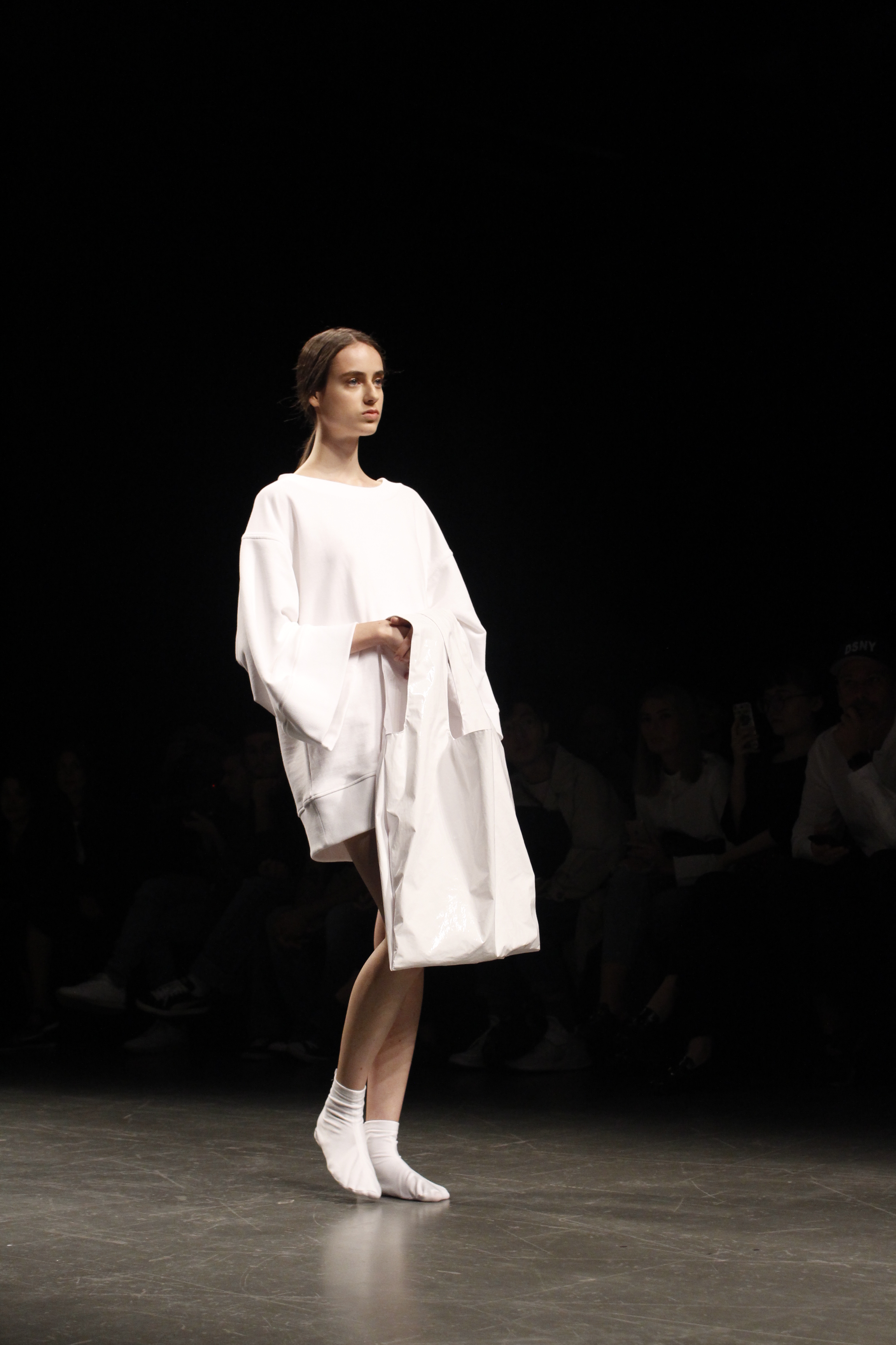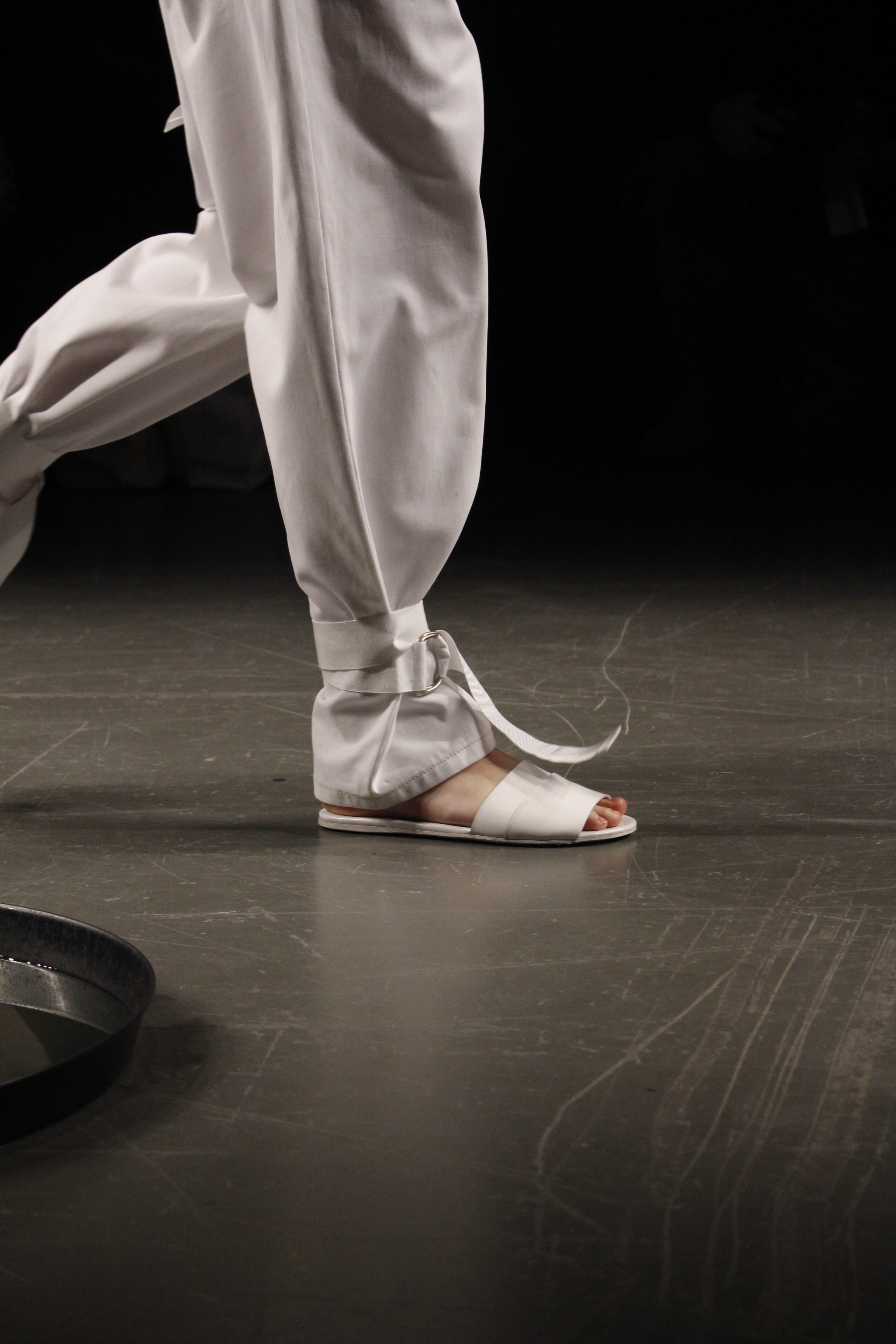 Lines are basic and are meant to respond to the most rudimentary human need to wrap, protect and cover oneself. Rectangular panels are closed with gros grain ribbons. Details such as panel fragments are placed vertical to the linear silhouette. Fluid knits featuring maxi-cuffs, and trousers with ankle-cuffs or waistbands offer a flair. Accessories emphasize the domestic tone of the collection, playing with patent textures in black or white; slippers, bags and bin bags or shopping bags are all made in this material.