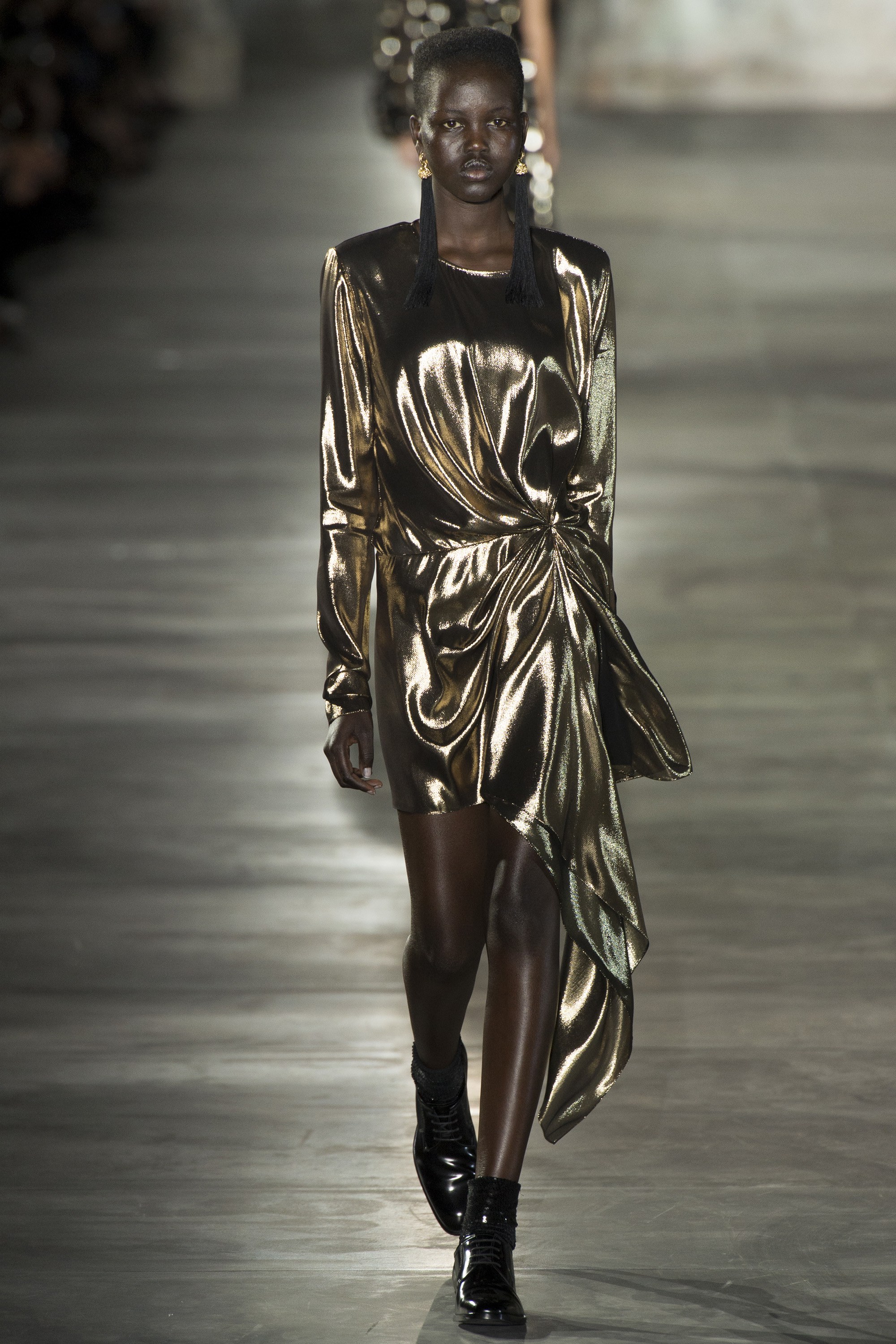 This idea translated well. Take the asymmetrical evening dress which fluttered by the slightest wind, it brought me such excitement… I saw the golden dots reflecting from the light and could recall the age of 80s glamour and sensuality à la Saint Laurent so clearly.