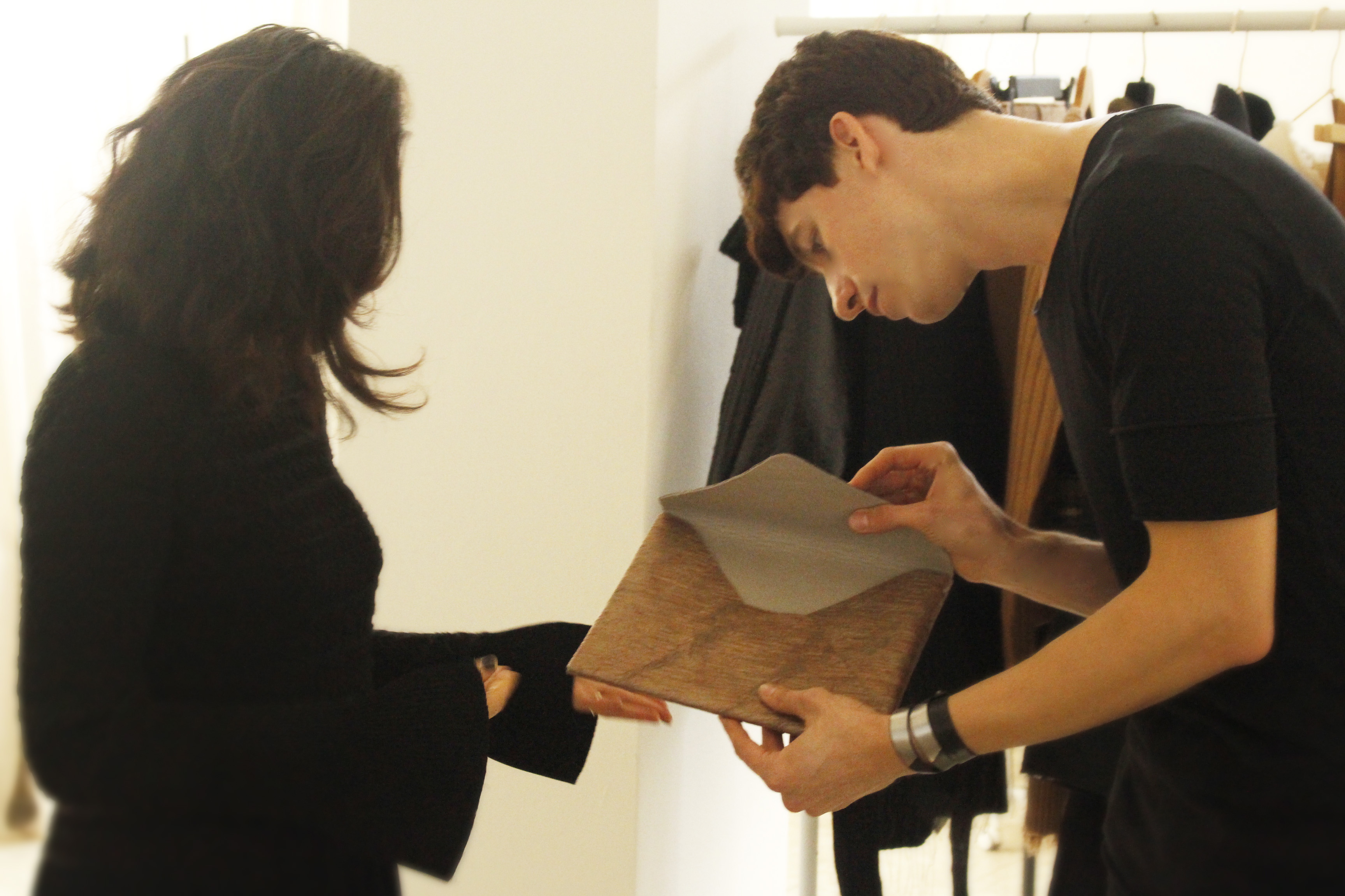 Roman Kozak inspects the Hugo Matha “Cobre Stone” envelope bag at the Aeré store headquarters in Milan (photo: ©Paloma Montanaro, 2016)
