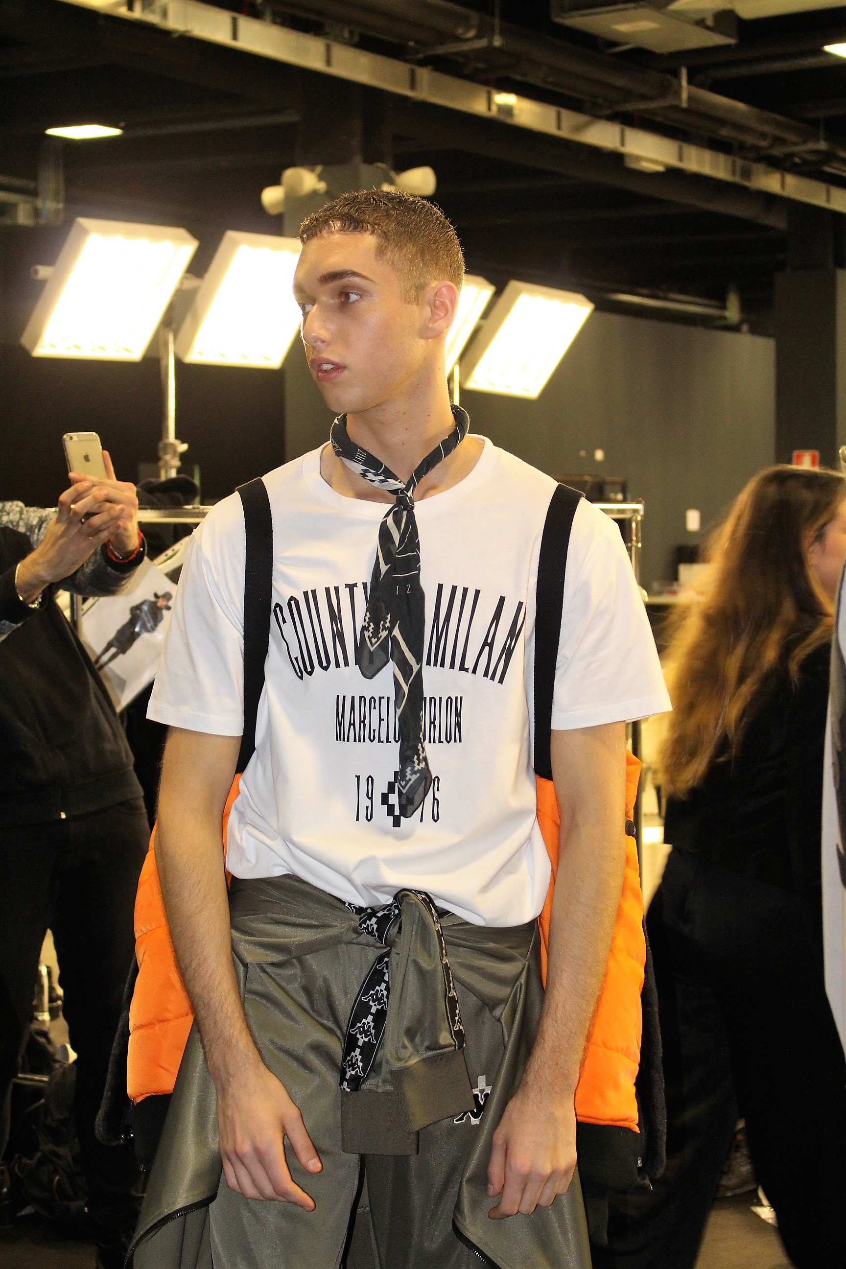 The goal for the Marcelo Burlon fall 2017 collection was to help men shop for core wardrobe pieces. The collection included hype tees and button-downs, military style trousers, and utility sport jackets. Burlon collaborated with popular design brands like Reebok, Starter, Alpha Industries, Kappa, and Ilariuss, keeping functionality in mind.