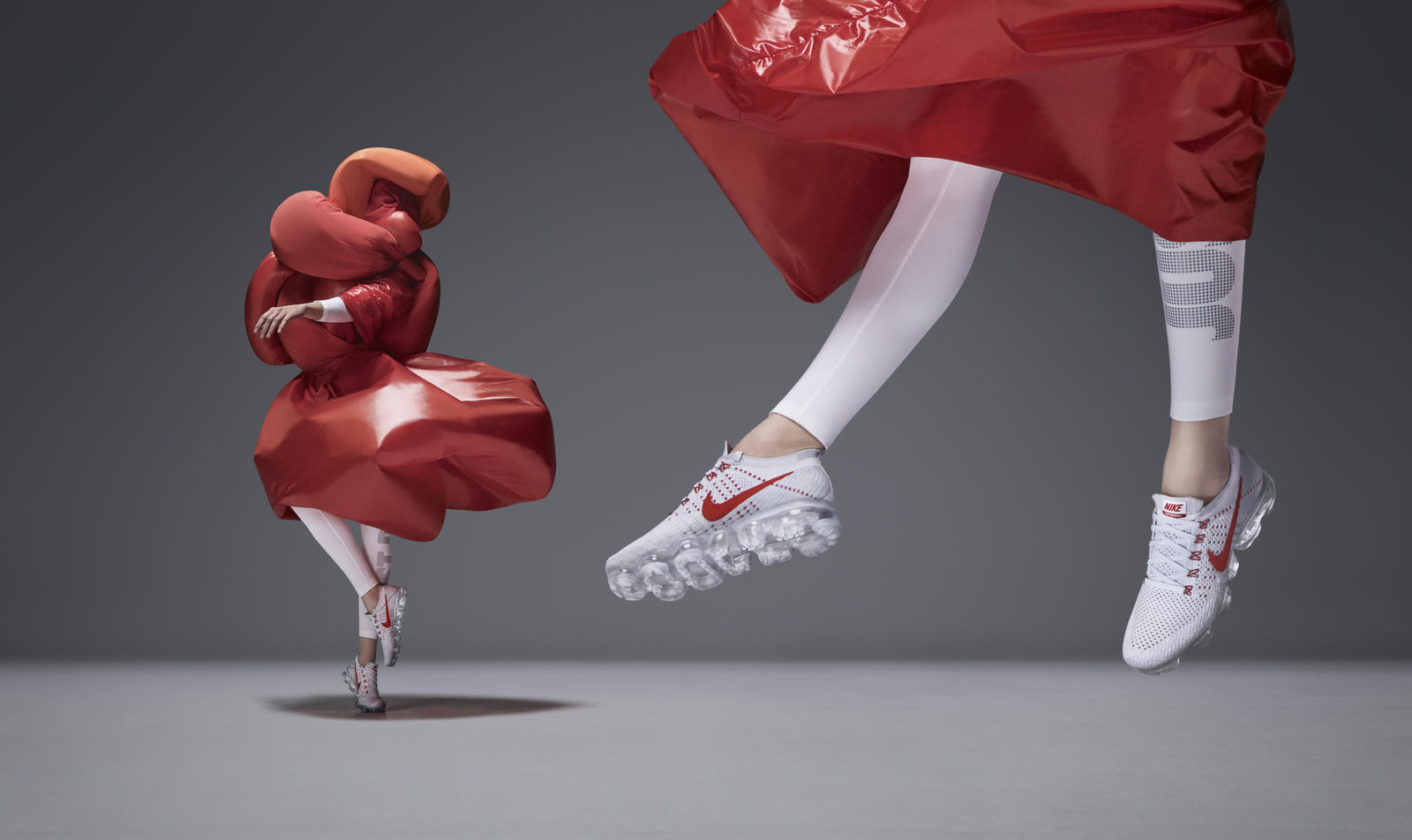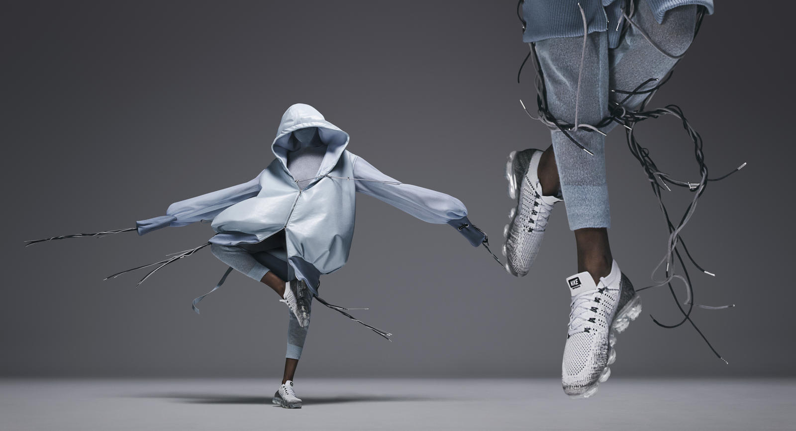 “The first idea came to life as an ode to all things airborne, with the lightness and flexibility of the Nike Vapormax providing a direct reference. The transparent air cushioning unit that acts as a standalone outsole inspired me to create a flawless outfit that creates harmony between body and environment.”