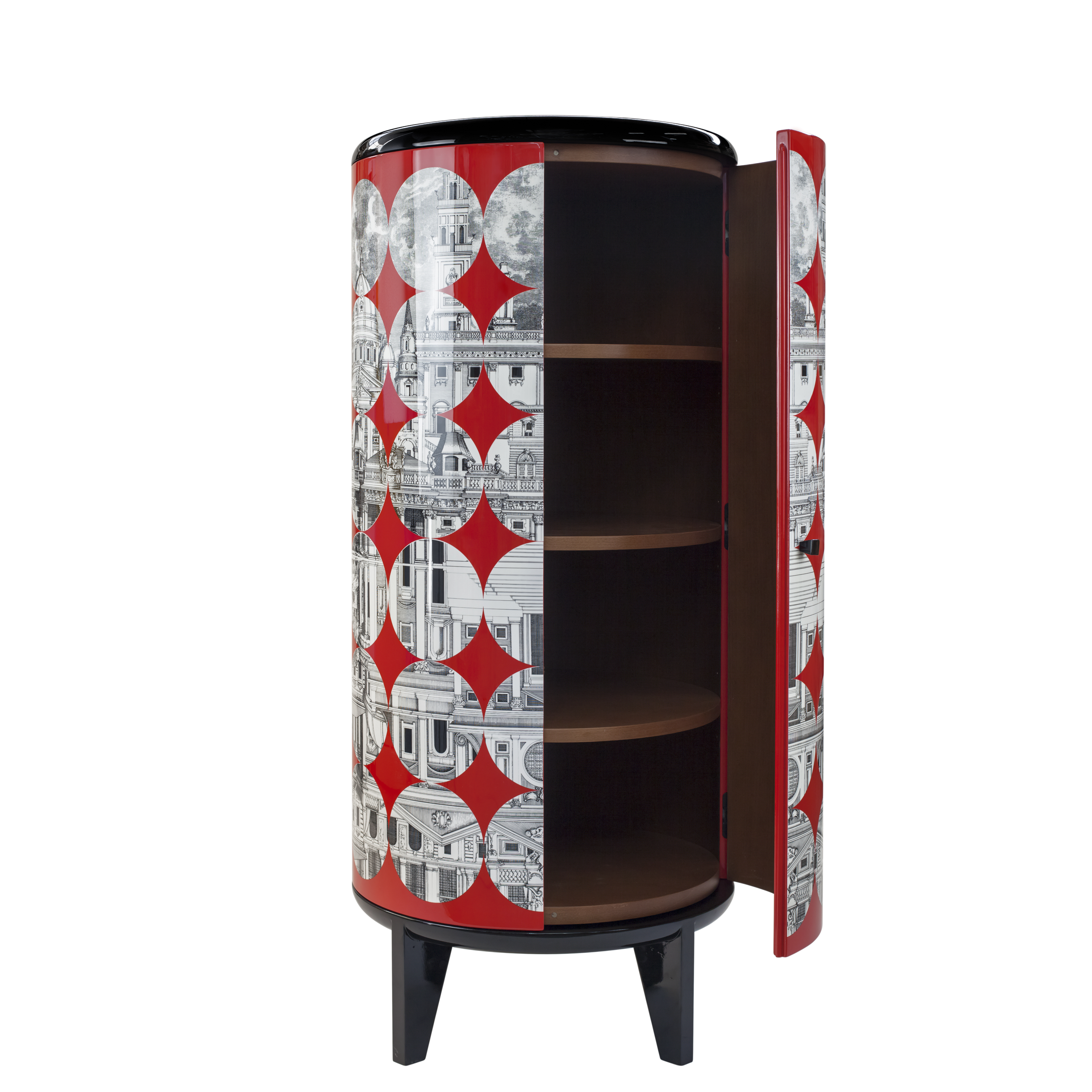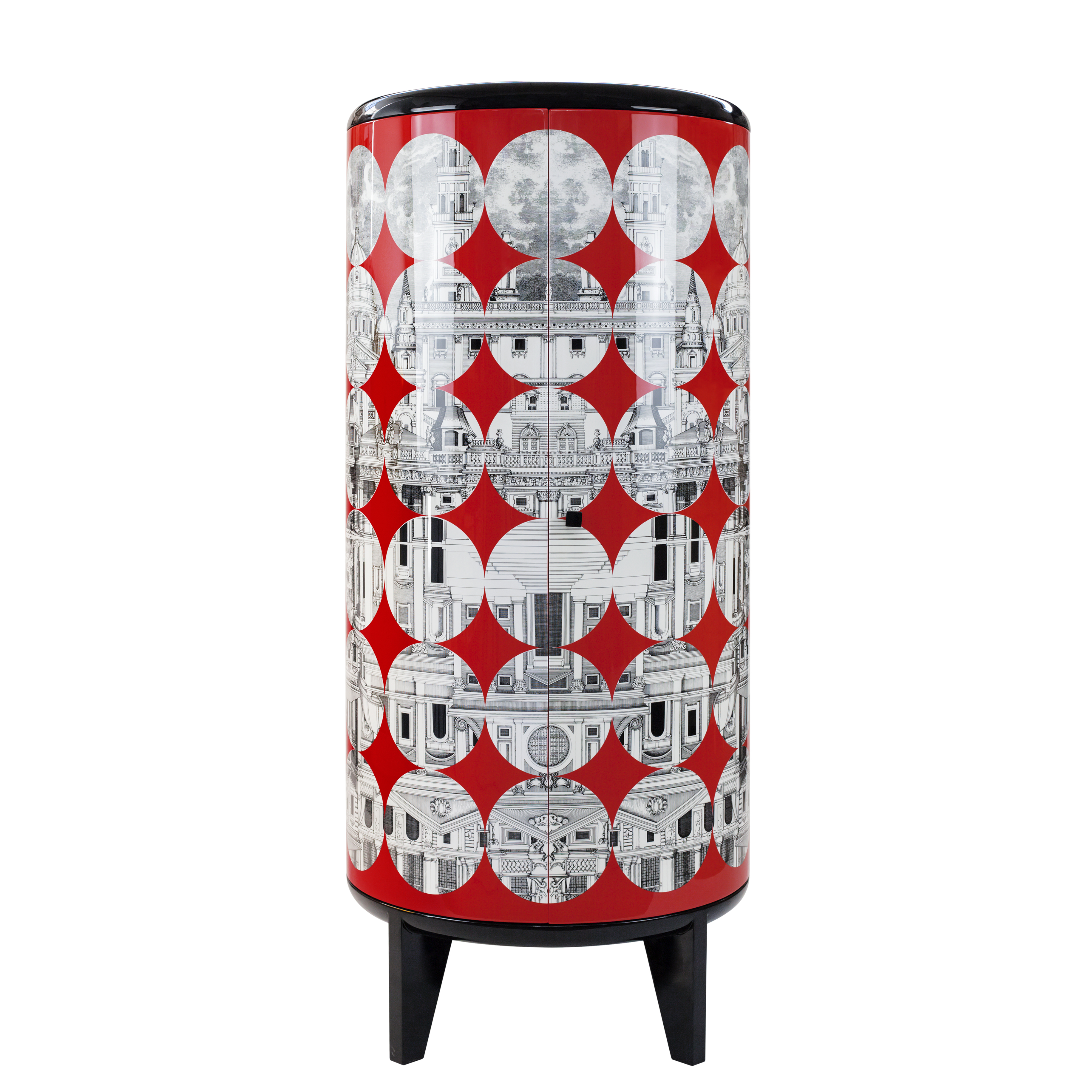 The storage design units are produced in three different versions including a “Cilindro” small table/storage unit (diameter 80cm x 61h), a cabinet for holding objects (diameter 60cm x 135h) and a tall display case (diameter 60cm x 145h) for glasses, bottles or anything one wishes to exhibit (like shoes). All three versions are made of wood, printed, laquered and hand painted, and they are available as limited editions with prices ranging from $10,000 to $25,0000.