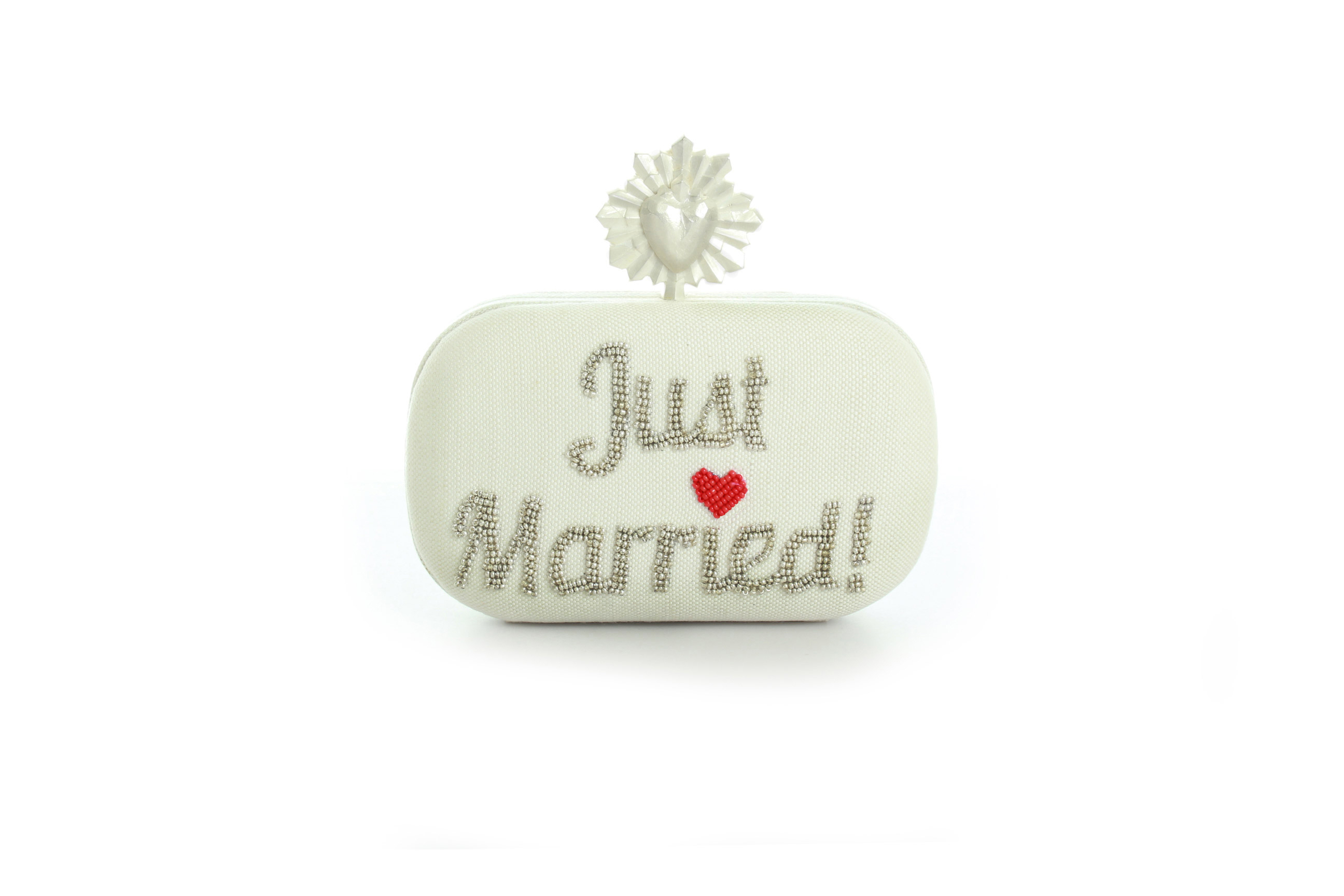 Sarah Bronfman’s ivory white, hand-beaded “Just Married” clutch was customized with “Mrs. Fallis” embroidered inside of a red heart.
