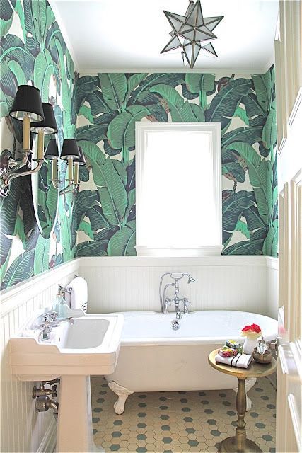 For sure nature-inspired wallpaper will be the easy and low maintenance route for a quick and easy bath remodeling project. But, to really create the feeling make sure you go for BIG and bright prints!
