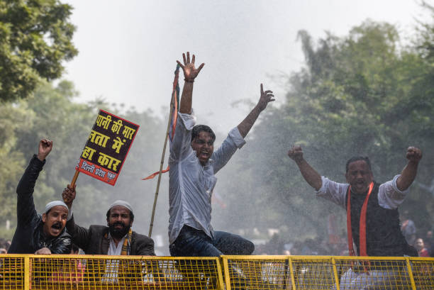 Police used water canons to disperse BJP supporters who protested against the water tariff hike and tried to march towards Delhi chief minister Arvind Kejriwals residence, in Civil Lines, in New Delhi, India. The Delhi Jal Board has approved a combined 20 per cent hike in water and sewer charges in the capital for consumption of over 20,000 litres a month.