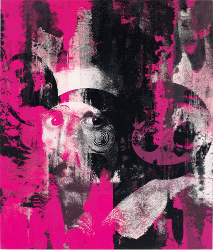 In another instance, Glance past the future (2018), they transform Gian Lorenzo Bernini’s 1623 self-portrait by superimposing Murakami’s character Mr. DOB to affect a graphic blur of pink and black, like a desecrated street poster leaving behind traces of an art-historical lineage.
