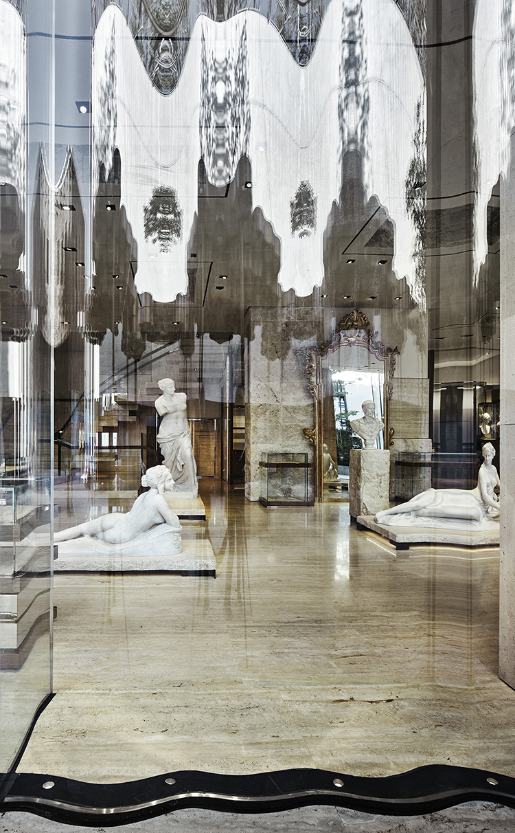 Beyond the entrance the two-story boutique is decorated with baroque mirrors and counters and walnut furnishings embellished with polished steel or gold velvet. A baroque style display counter holds a selection of their precious jewelery.