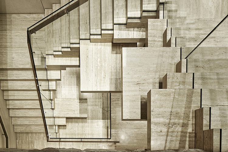 Connecting the two floors is a travertine staircase. The stone slabs are used for the stairs and float along the walls and ceiling. They transition the theatrical themed store from onstage to the backstage.