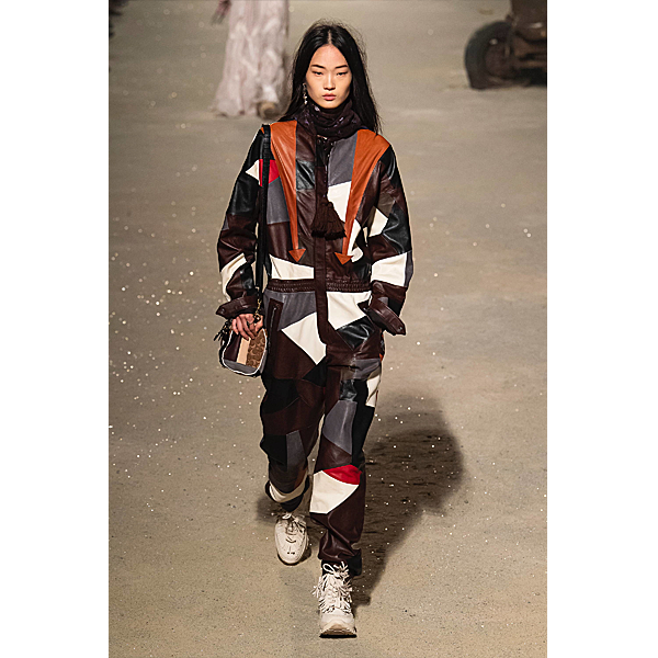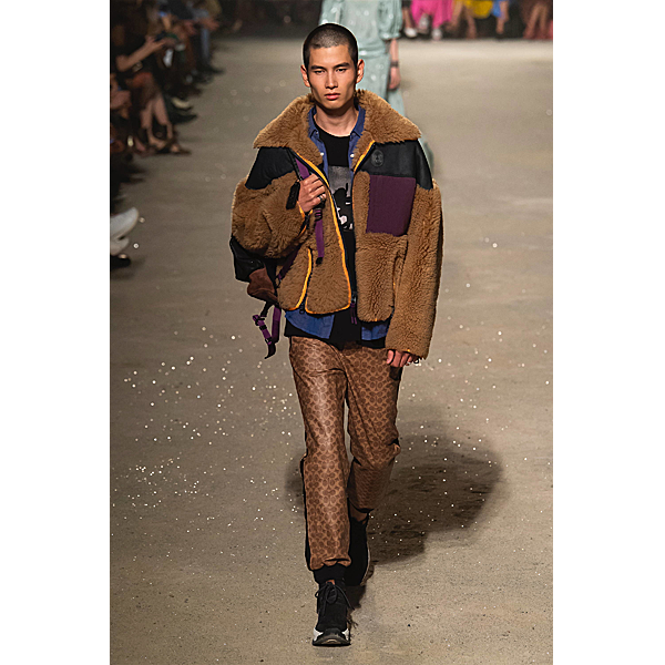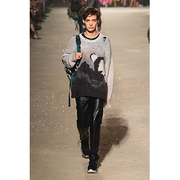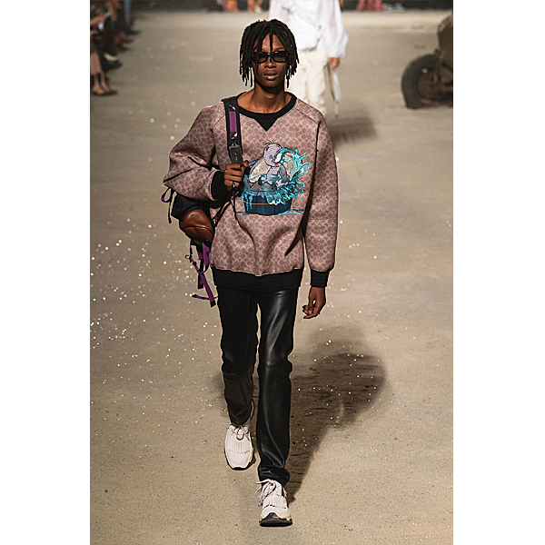 Luxury fashion meets desperado in Coach 1941’s Spring 2019 collection. Designer Stuart Vevers strings together pieces ranging from washed leather coats and torn knit sweaters to leather fanny packs, fur bomber jackets, leather tracksuits, and a hoodie with 3 famous cats you may recognize on the front of it.