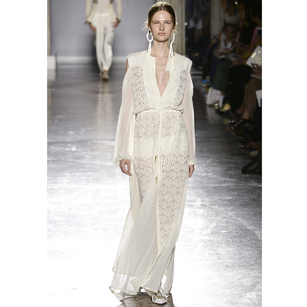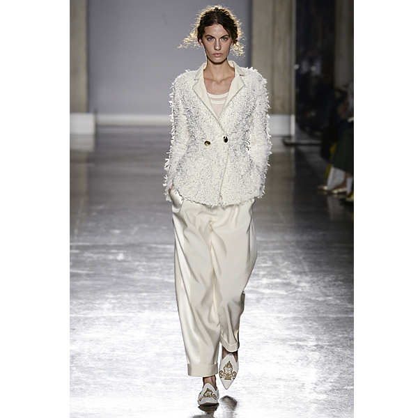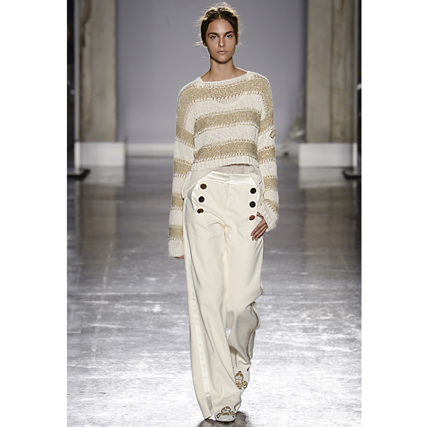 The colors stay simple as white and metallic build up the foundation of the collection and touches of gold exaggerate it. Angelic and goddess-like seems to be the vibe Les Copains want for this show.