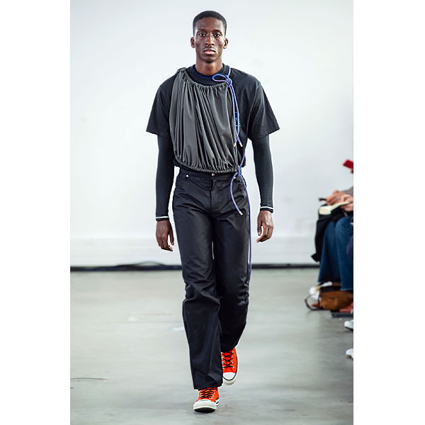 With a rather dull color palette we find most of the excitement coming from the technical aspects and irregular cuts. A couple noticeable trends include many loose hanging bungee cords and straps, as well as oversized baggy cuffs along the ankles of the pants.