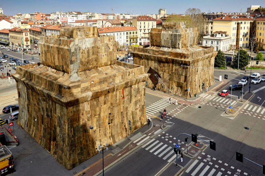 A Friend is a massive, large-scale installation using the Porta Venezia towers as a base structure. The arresting installation is presented by fashion maison Trussardi in collaboration with Ghanaian artist Ibrahim Mahama. For centuries the Porta Venezia towers have been known as Milan’s gateway marking the border that separates the urban fabric of the city from the countryside. The classic towers have been covered in recycled fabric creating a breathtaking new aesthetic for the medieval architecture.