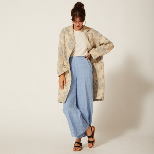 The Spring 2020 collection consists of oversized coats and double-breasted jackets in Italian linen, with matching clam dig trousers cuffed above the ankles. There are portly summer cashmere sweaters in easy colors. And his signature, soft poplin t-shirts and Italian leather sandals in natural colors. The silk dresses pair well with the soft shouldered jackets. The linen/ wool blend Heritage suit, the most formal look presented, is a great casual Friday office look.
