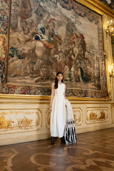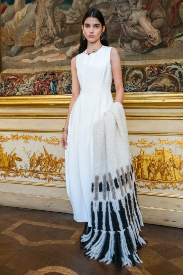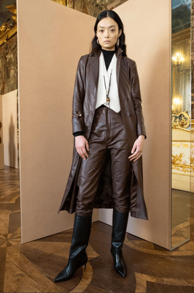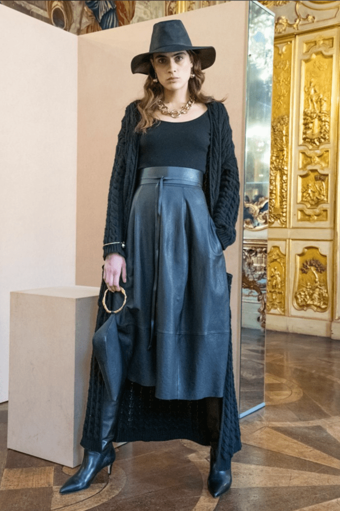 In the collection we found a clean and comforting silhouette, courtesy of the body-hugging knits and elongated outerwear. Cloak-like garments and top-coats layered over sweeping dresses in precious fabrics consisting of gauzes as well as loro piana cashmere. The color palette, kept very rich and produced by natural dyes, consisted of cloud-white, beige, coral, and sumptuous browns. Tying in the looks were equestrian hats and gloves, paired with high-top heels and riding boots — topped off with boujee gold and rigid jewelries.