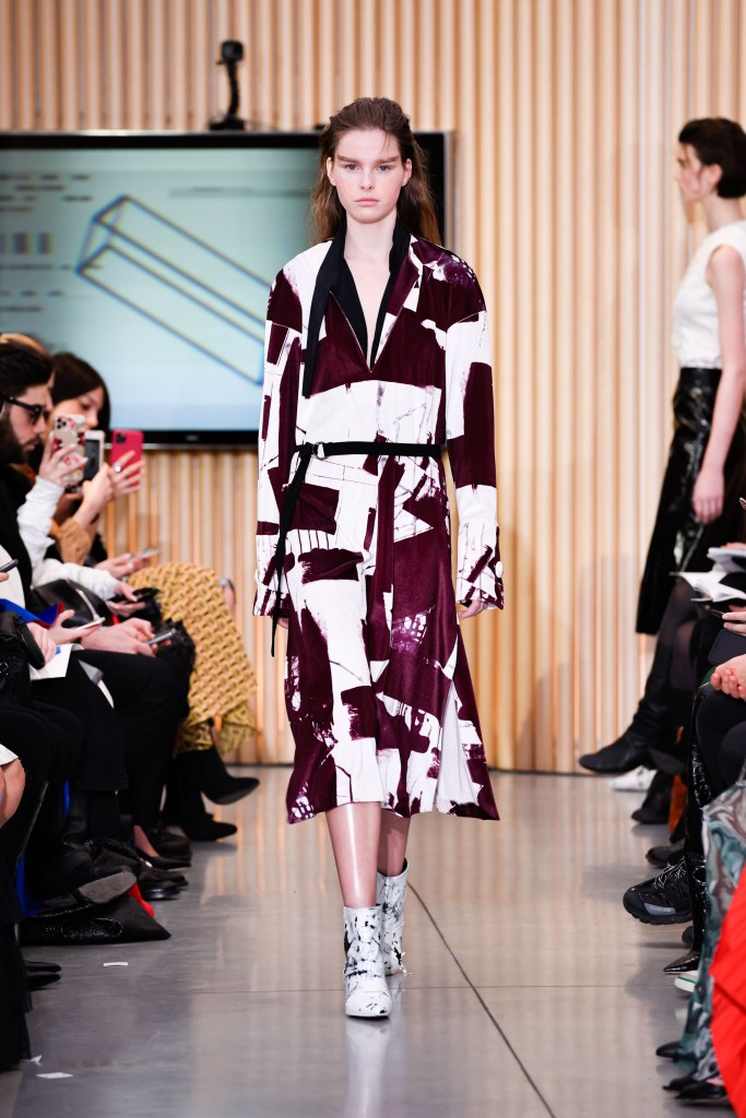 Milan, Italy — “Tilt System” the title of the Gilberto Calzolari fall 2020 show and the designer’s latest innovative fashion week endeavor, resulted in a collection presented as a progressive approach to seasonless design, reflecting on the current dealings of sustainability and over-consumption. Calzolari held the show inside the modern walls of the Volvo studio in Milan’s popular Garibaldi district, an area surrounded by high-end design constructions well-known for its instagramable Bosco Verticale, a set of towering residential buildings coated in plants. The Volve Studio interiors were a fusion of artificiality with nature and a modern-day take on design, the towers a complimenting resemblance to Calzolari’s collection. The designer’s intentions were clear, the environment is at the forefront of his brand’s DNA and design ethos.